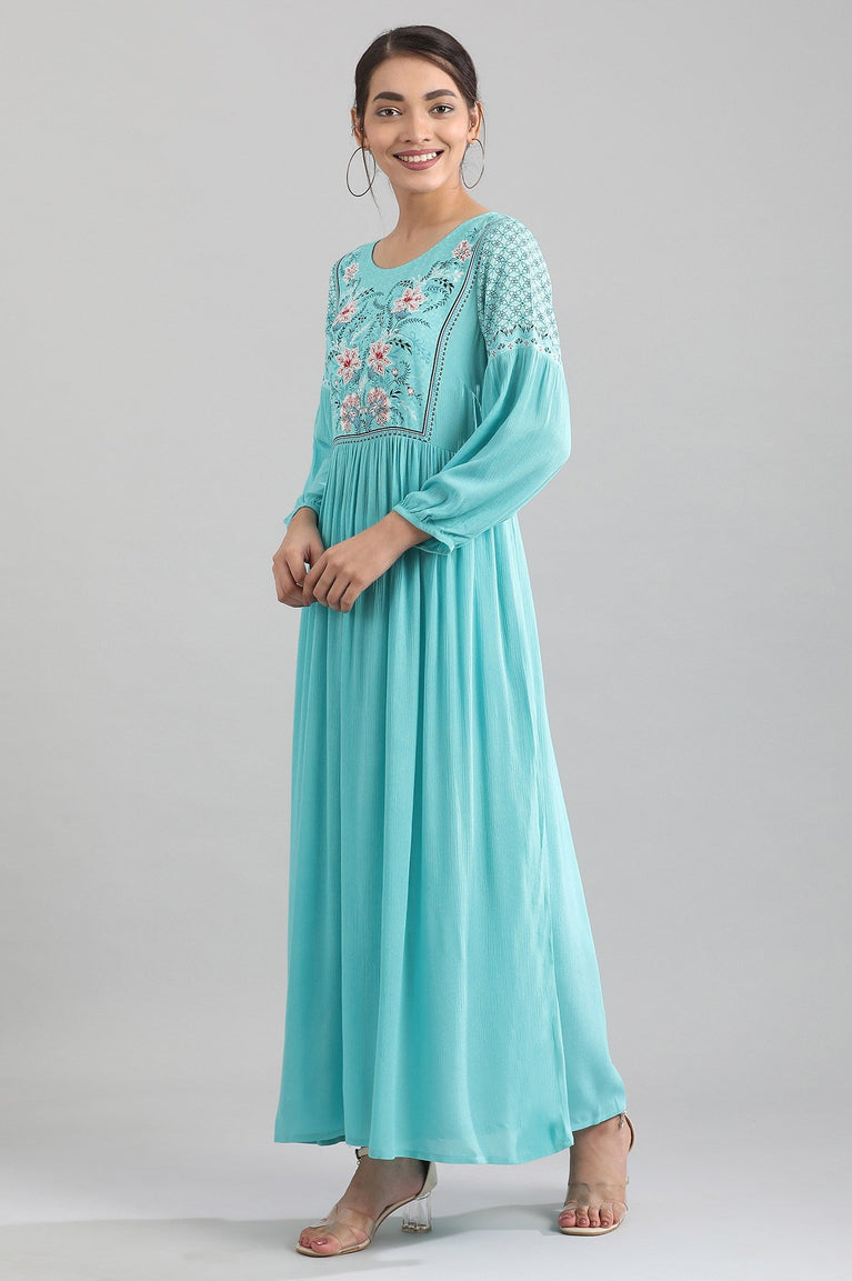 Let's get sorted for the next festive look with this gorgeous flared dress by Aurelia. The dress has circular body detail and mandarin collar, the yoke is adorned with zari embroidery and it flatters ornamental pattern all over. The dress has elegant three-quarter sleeves with embroidered cuffs.