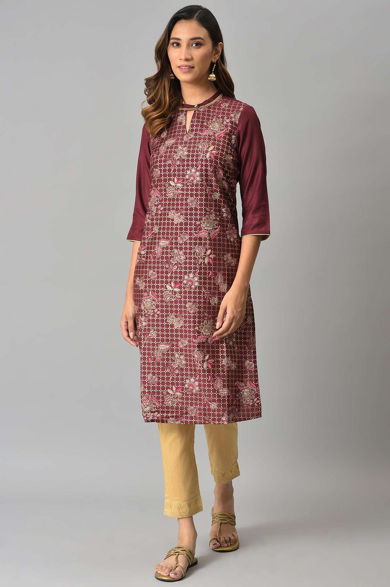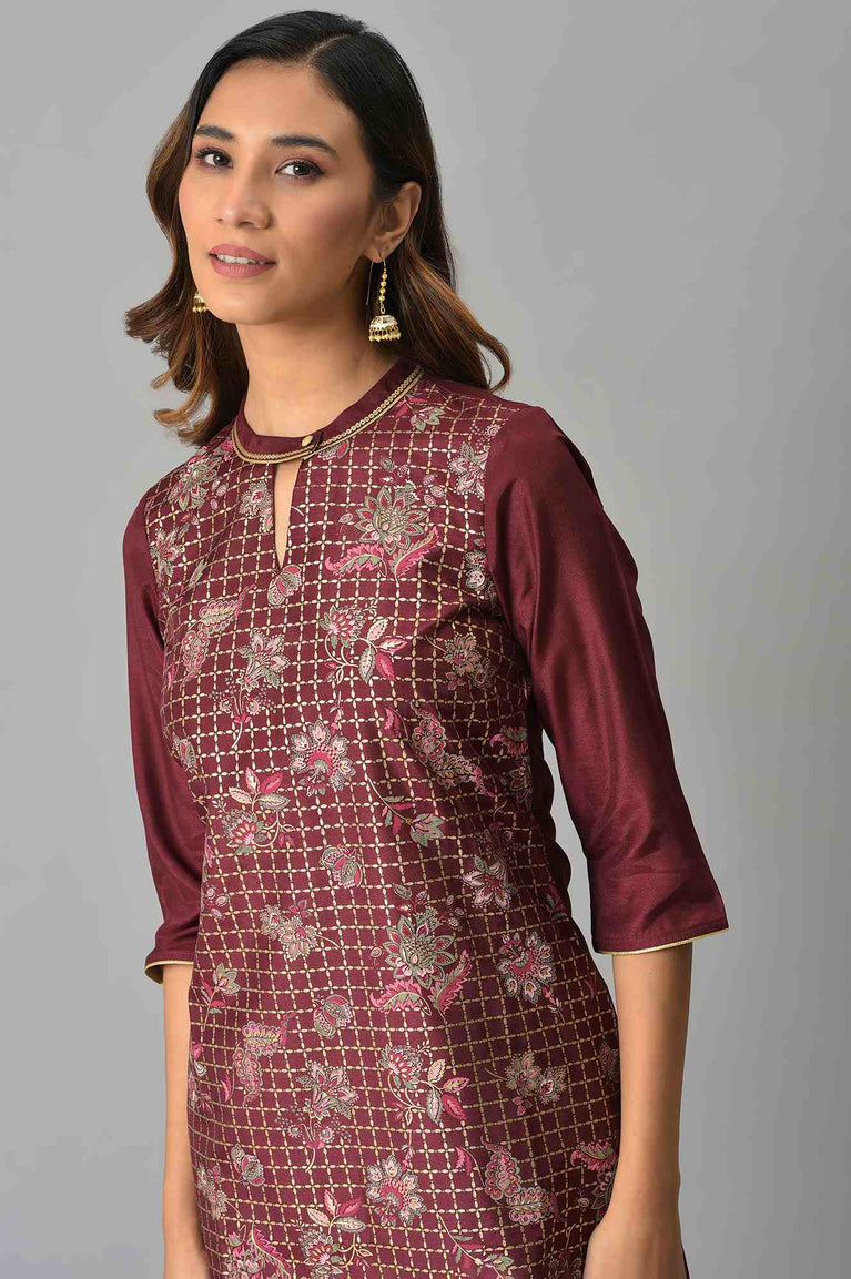 Classic And Elegant, This Straight Dark Berry Brown Kurta Comes With An Overlapped Collar Detail With A V-Slit. It Features A Contemporary Print That Includes Decorated Florals On Top Of Patterned Checks.
