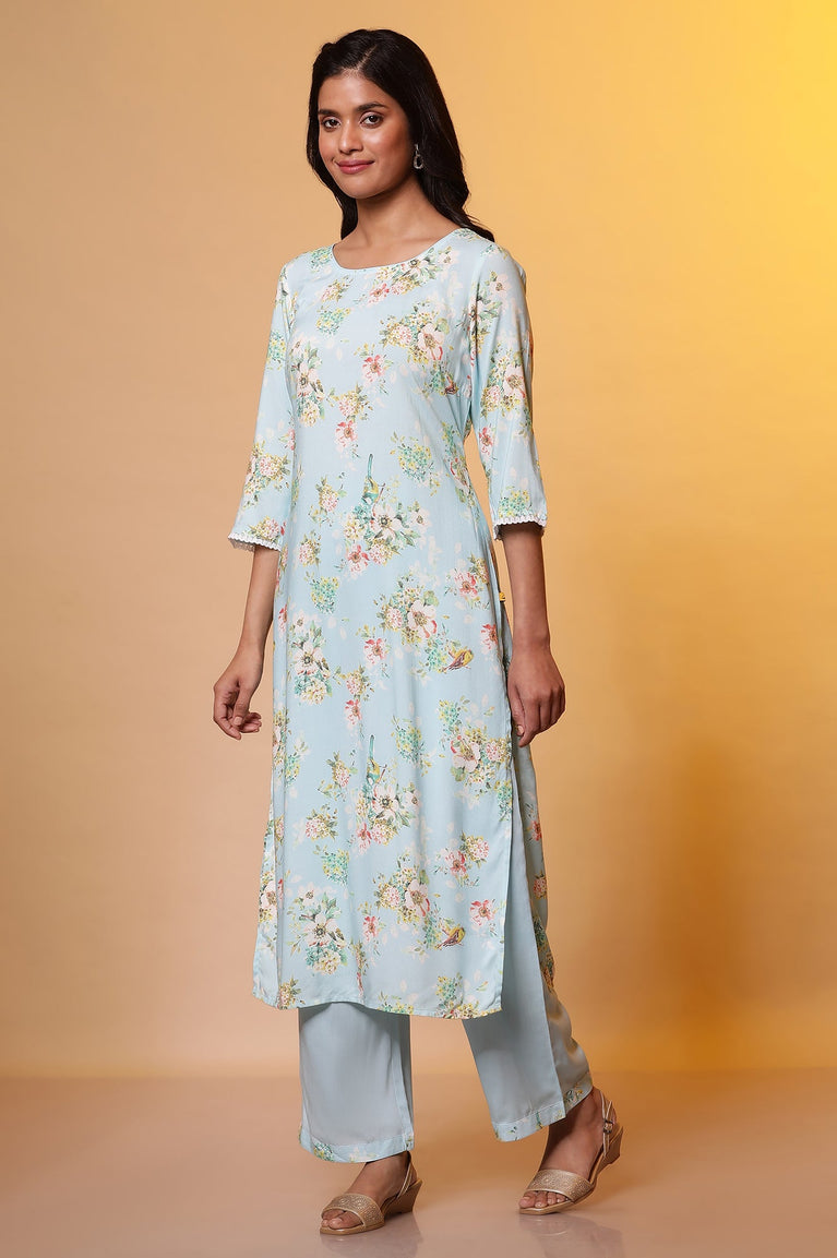 Blue Floral Printed Straight Kurta, Pants and Dupatta Set