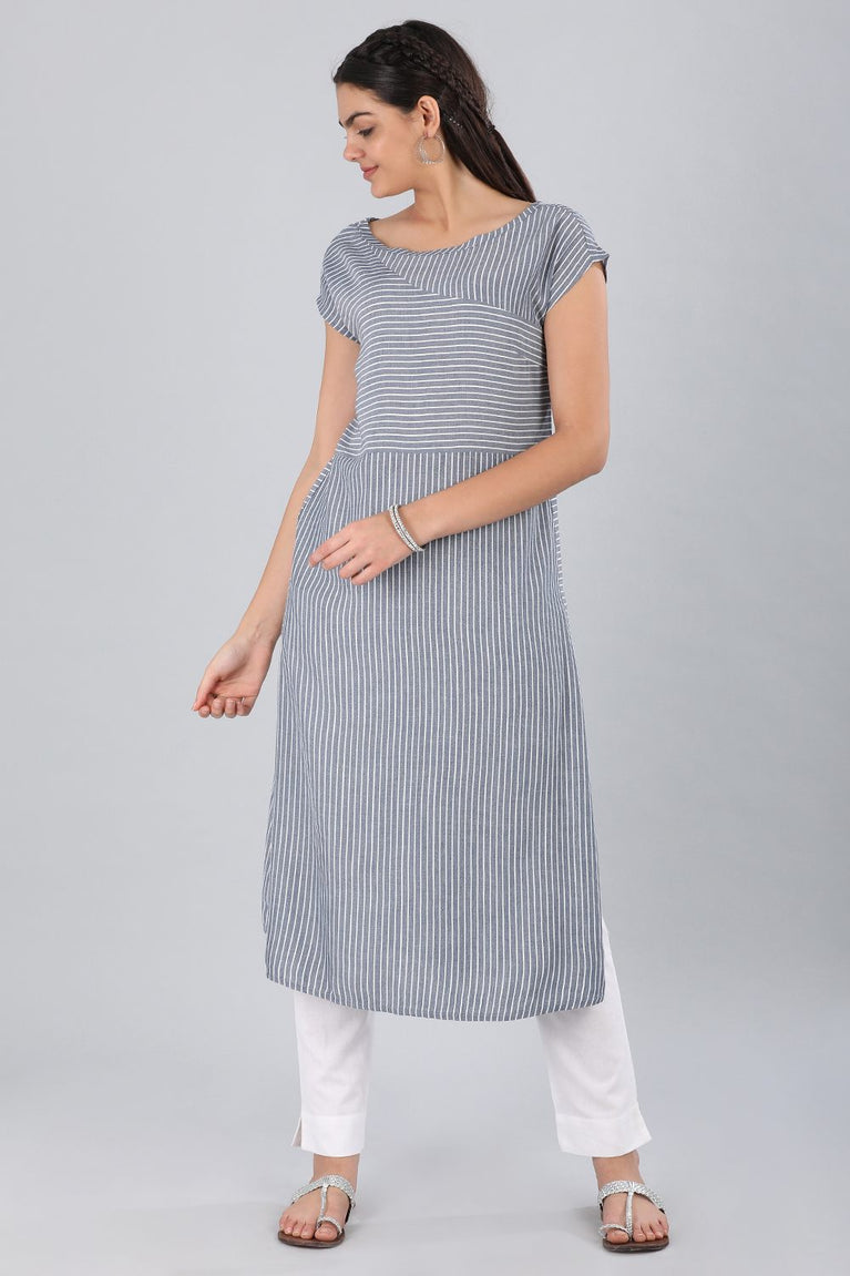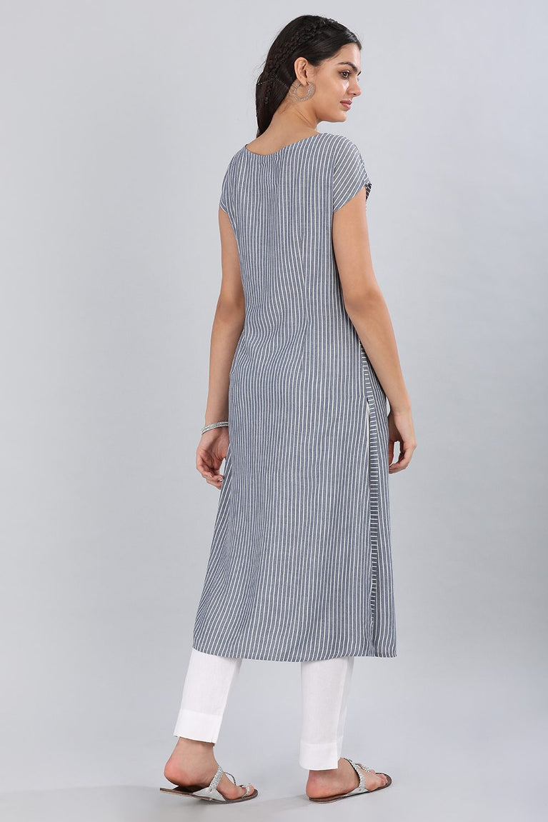 Blue band collar A-line yarn-dyed kurta with flared sleeves and tie-up.