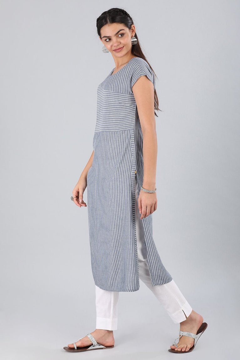 This blue collar neck 3/4 sleeve kurta has side slits.