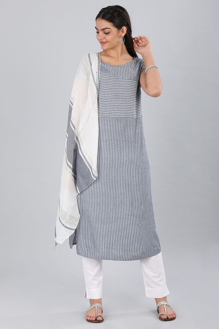 Crafted in exclusive zari cotton dobby and with an exquisite embroidery, this kurta is an absolute statement piece fit for any occasion. It consists of a round neck with collar and cuff detail on the sleeves. Pair it wih our Yellow palazzo for that pop of colour and our woven stripped dupatta.