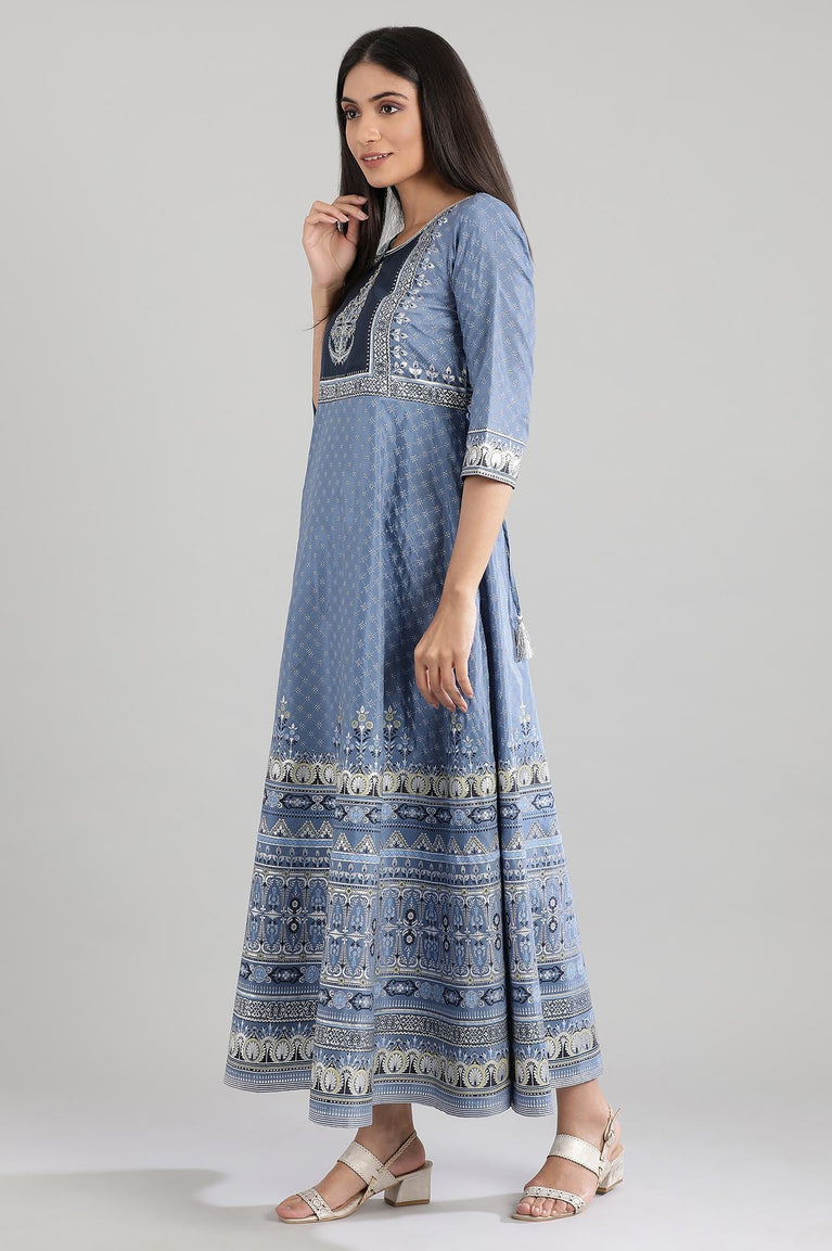 Blue Floral Printed with Zari Embroidery Liva Dress and Dupatta Set