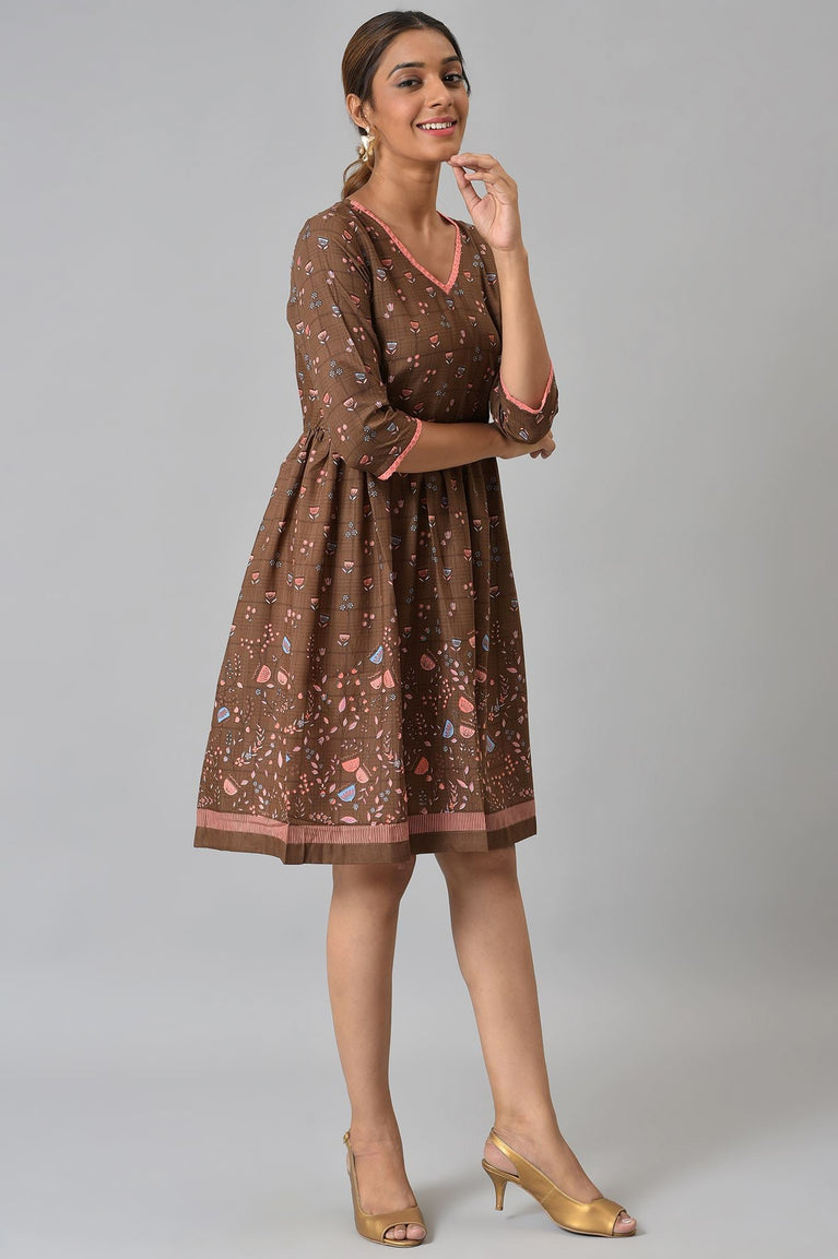 Be In Spot-Light With This Brown Floral Printed Flared Dress. The Dress Has V-Neck And Three-Quarter Sleeves.