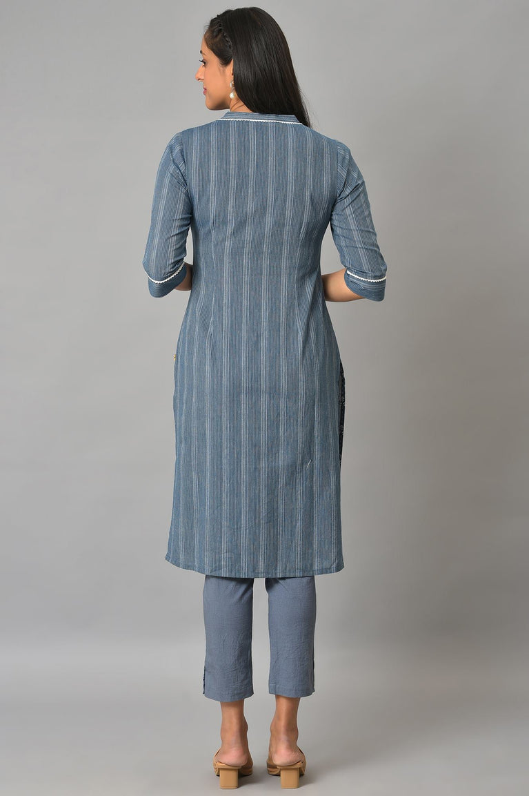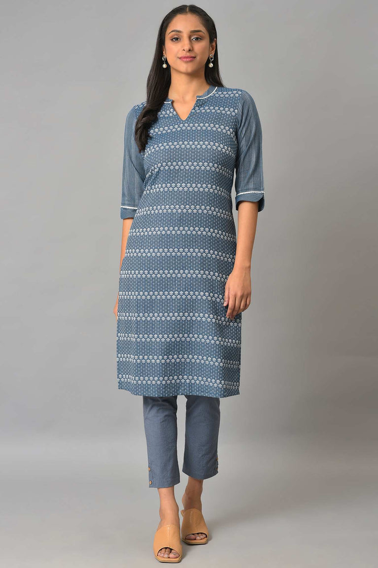 Get styled for the light festive event in this stunning set. The set has blue printed kurta round neck with button closure. It is paired with gold trouser pants.