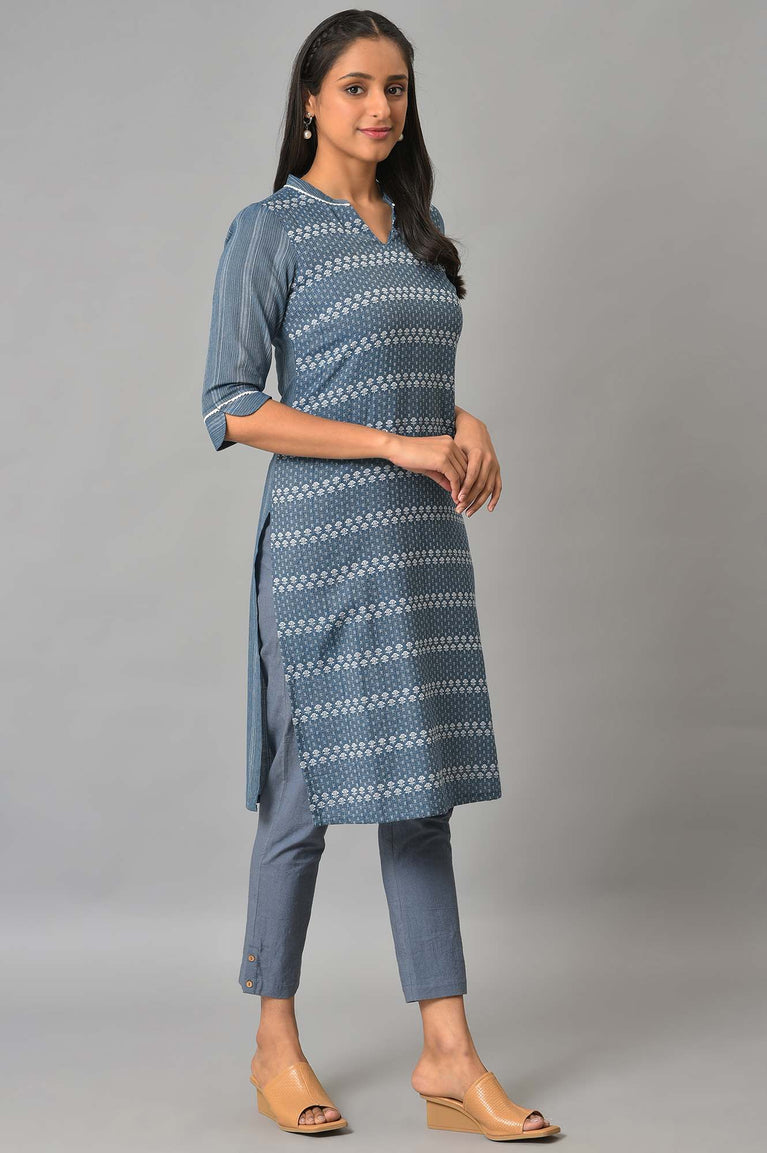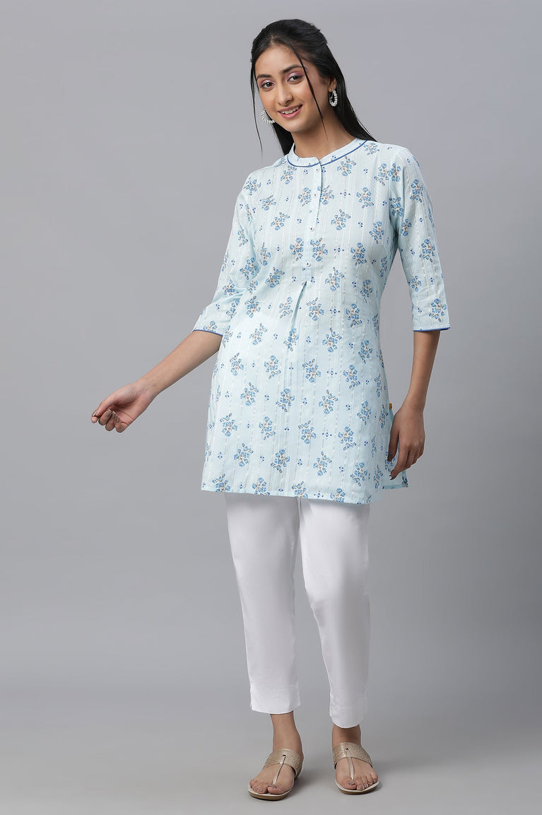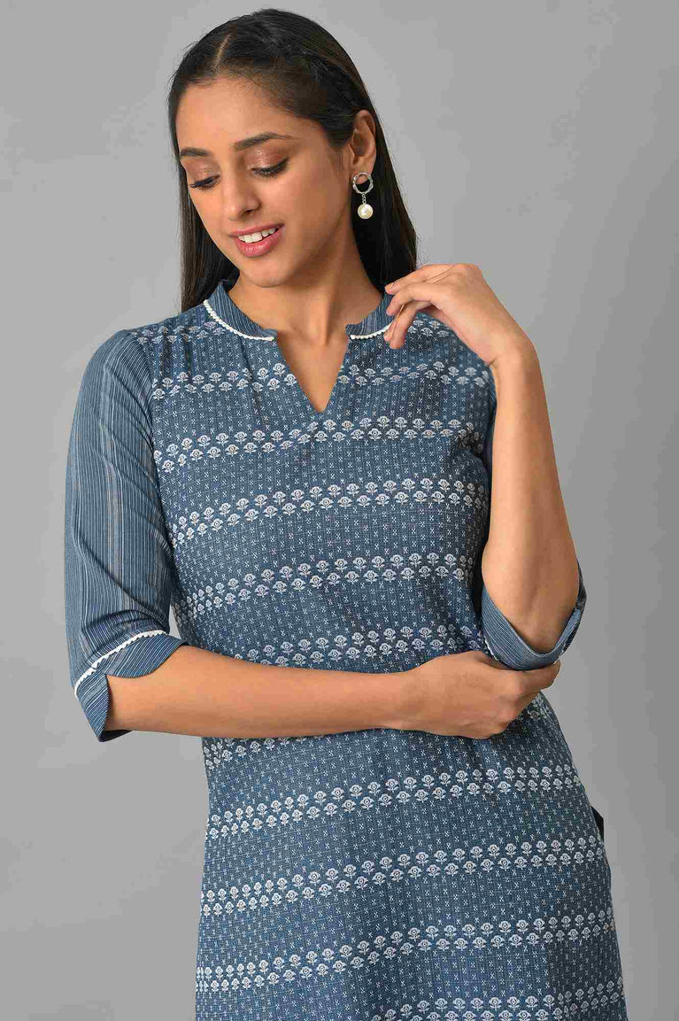 This kurta Is Perfect For A Casual Day Out With Friends. It Is A Floral Printed kurta In Self Textured Fabric Featuring A Mandarin Collar With Placket And Inverted Box Pleat Detail And Three-Quarte Sleeves Enhanced By Contrast Piping.