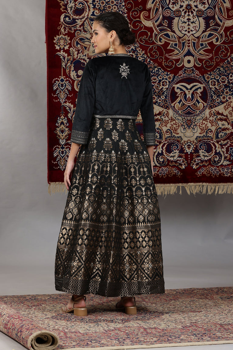 Black Yarn-Dyed Sleeveless Anarkali Dress and Embroidered Short Jacket Set