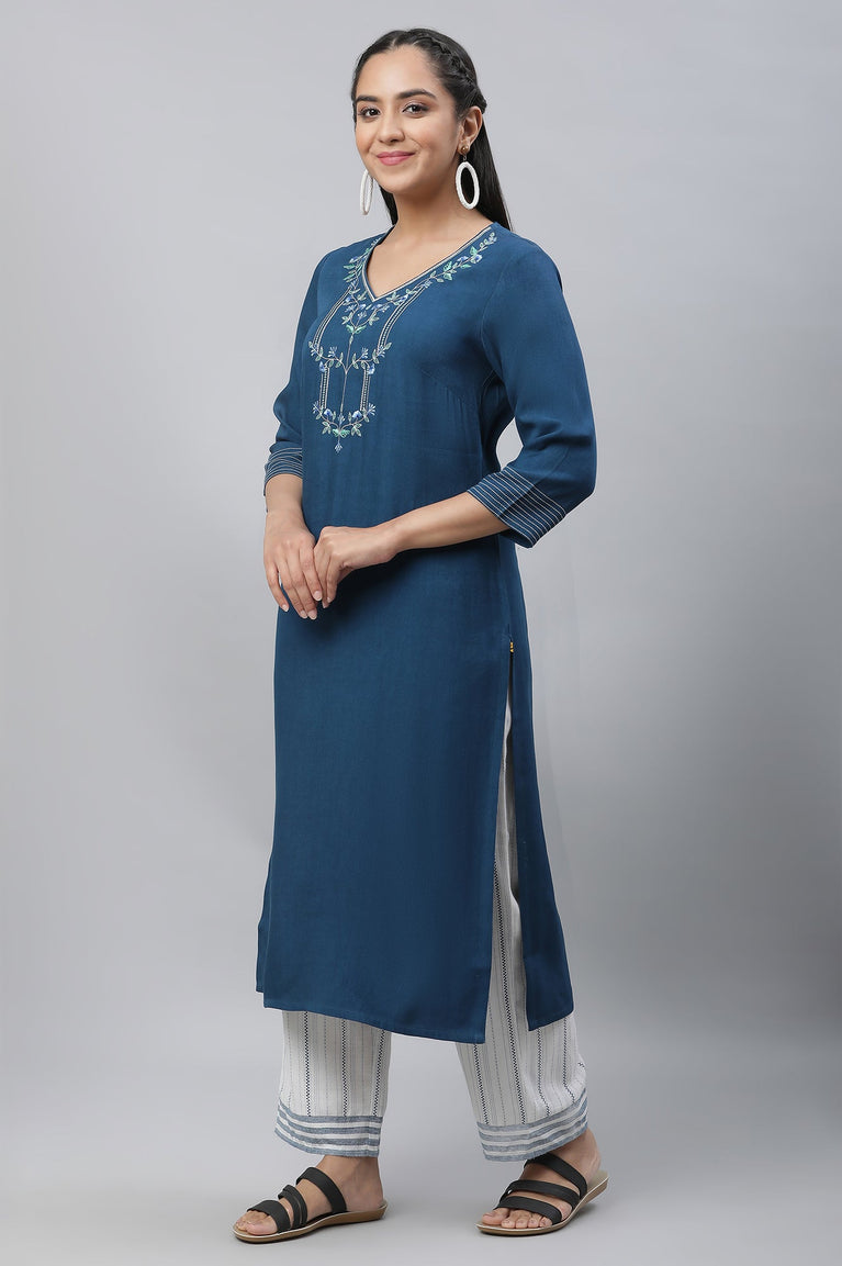 Peacock Melange Modern Ethnic kurta In Round Neck With V And Straight Hemline.