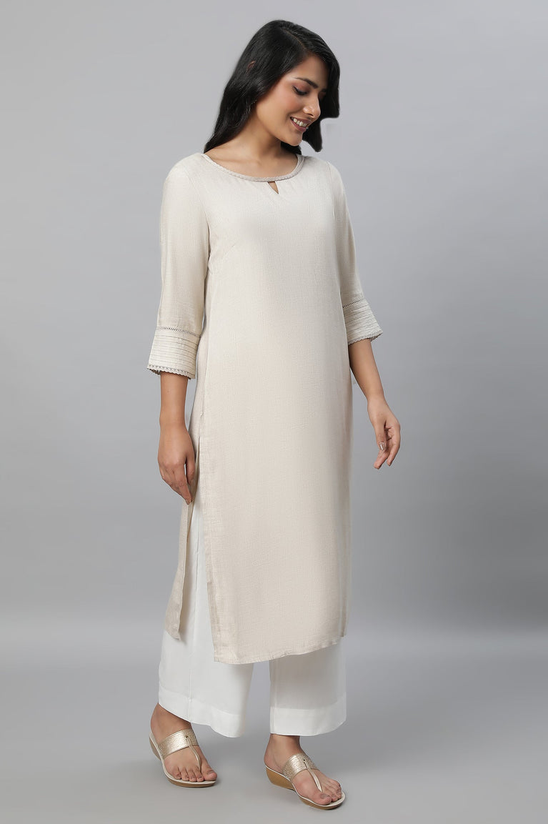 Elevate your casual wear with this fusion-inspired kurta from Aurelia. This mid-calf length piece showcases a perfect blend of traditional and contemporary styles. Crafted using a woven construction technique, the kurta features a comfortable round neckline and practical three-quarter sleeves. The off-white color offers a versatile canvas for various styling options. Made from a cotton blend fabric (87% cotton, 13% nylon), this kurta ensures breathability and ease of movement. The A-line silhouette flatters various body types, while the dori embroidery adds a touch of intricate detailing. Designed for casual wear, this kurta is perfect for everyday elegance. The cotton blend material provides durability and comfort, making it suitable for extended wear. Whether paired with leggings, palazzos, or jeans, this Aurelia kurta offers a chic and effortless look for the modern woman.