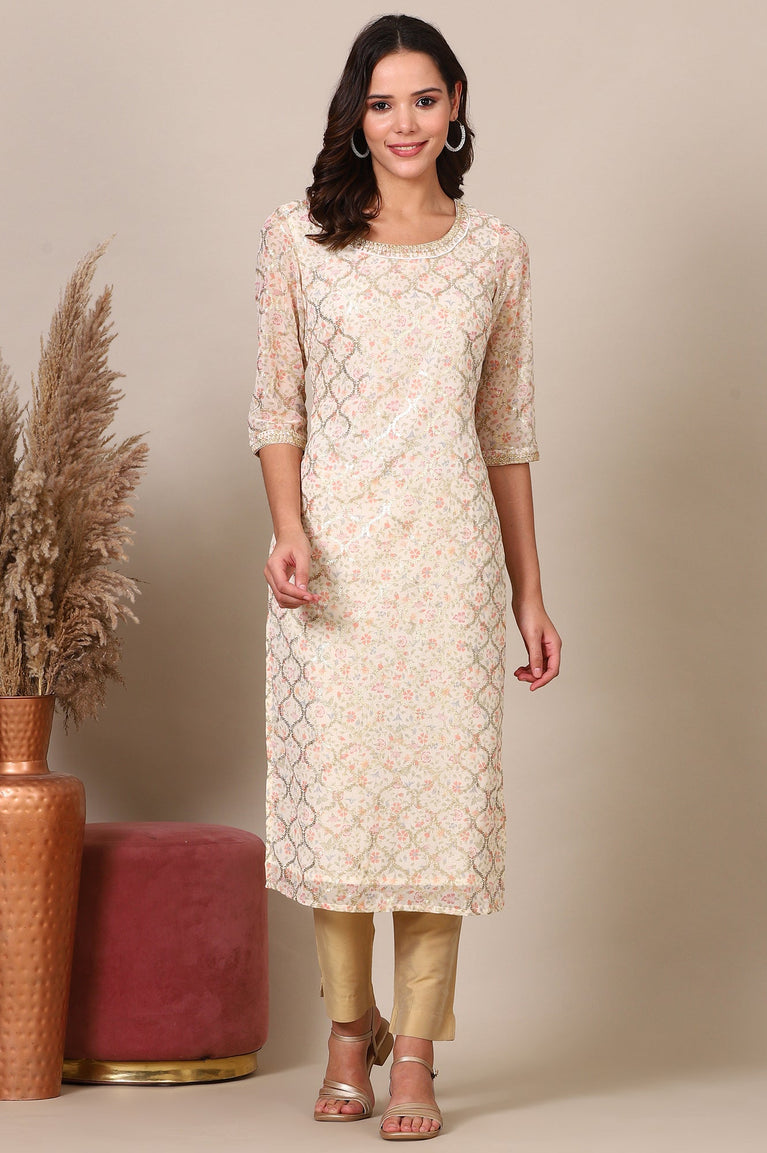 Beige Floral Printed Straight Kurta