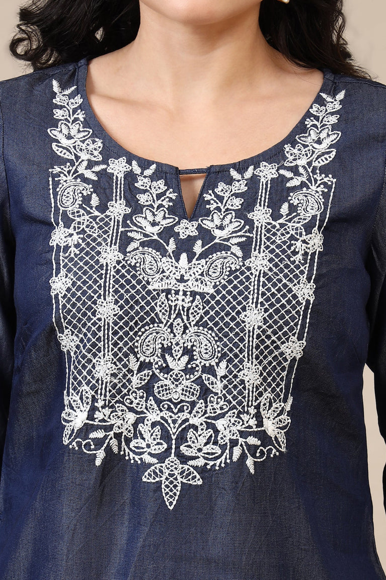Blue round neck 3/4 sleeve kurta with embellished yoke detail.
