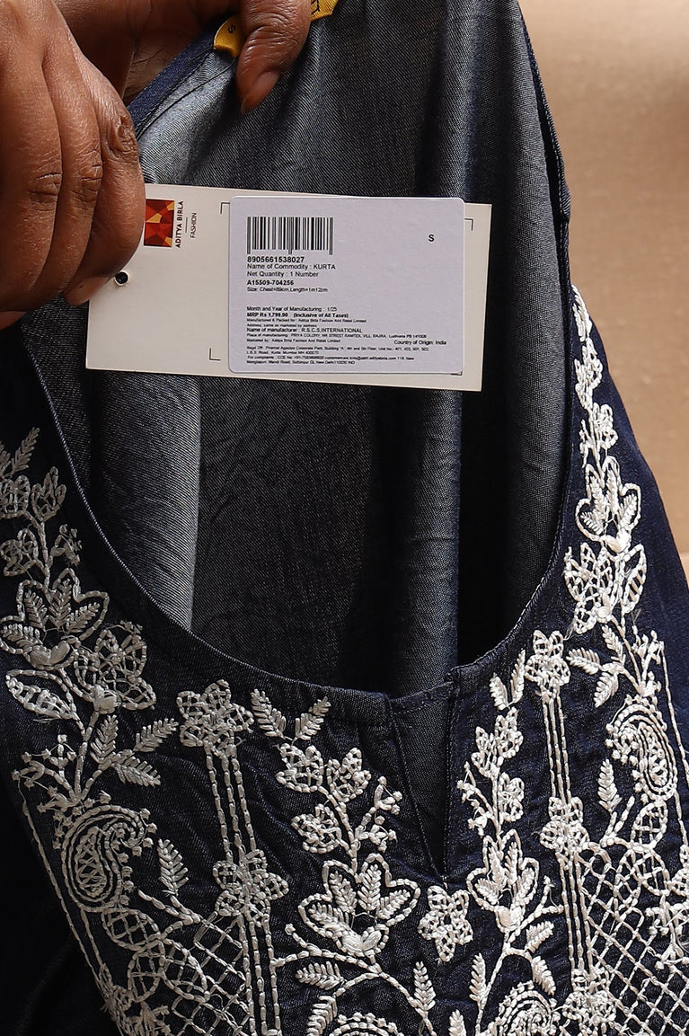 Blue Relaxed Fit Embroidered Yoke A-line Denim Kurta