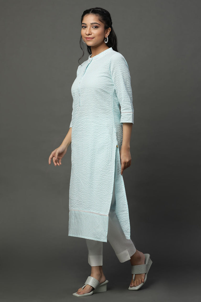 A straight kurta crafted from delicate seer sucker fabric in soothing blue and white hues, it gives a sense of elegance. The classic mandarin collar and a front placket adorned with tasteful buttons create an aura of sophistication. The element which truly sets this ensemble apart is, the intricate lace insert at the collar, sleeve and hem of the kurta. Every detail whispers a story of refined taste, making it the ideal choice for work or casual wear.