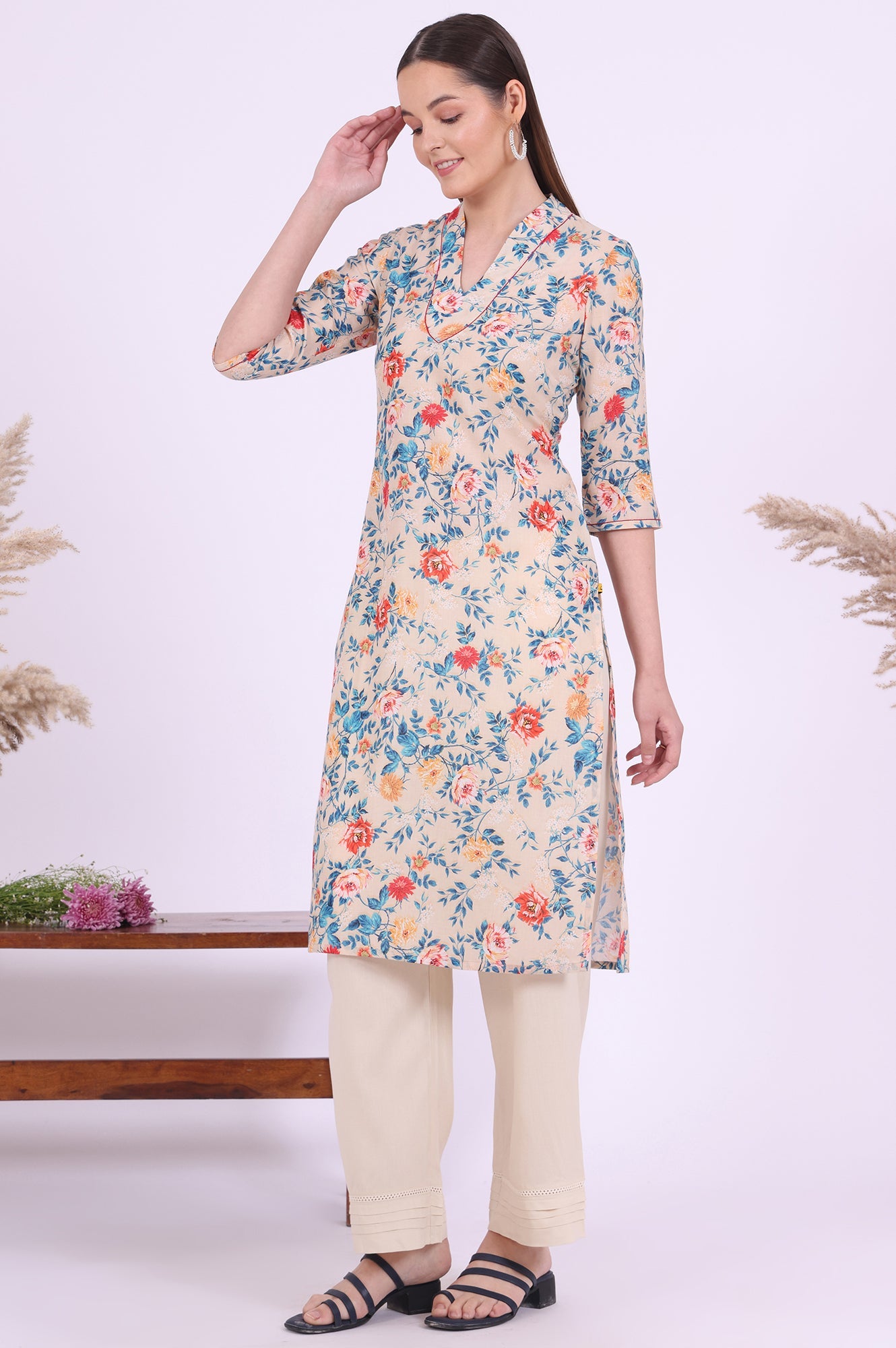Discover effortless elegance with this fusion-inspired knee-length kurta from Aurelia. Crafted with a v-neck and three-quarter sleeves, this beige-colored piece is perfect for casual occasions. The woven construction technique ensures durability, while the polyester blend fabric offers comfort and easy maintenance. The straight silhouette is complemented by a stylish slit detail, adding a touch of modern flair to this traditional garment. Designed for women who appreciate a blend of contemporary and ethnic styles, this kurta seamlessly combines fashion and functionality. The versatile design makes it suitable for various casual settings, allowing you to express your personal style with ease. Whether paired with leggings, jeans, or palazzo pants, this Aurelia kurta is sure to become a staple in your wardrobe, offering both comfort and style for your everyday wear.