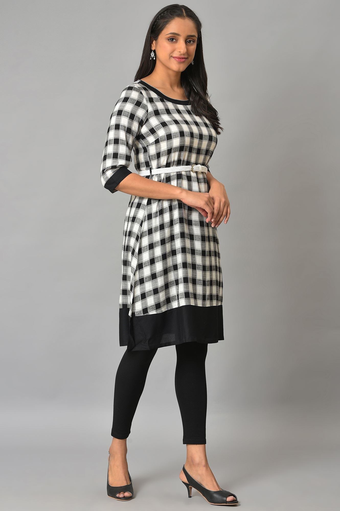 Crafted In Soft And Breathable Dobby, This Modern Checkered A-Line kurta With A Belt At Waist For Cinching Is Definitely A Go-To Choice. This Ensemble Can Be Paired With A Tonal Black Cropped Tights.