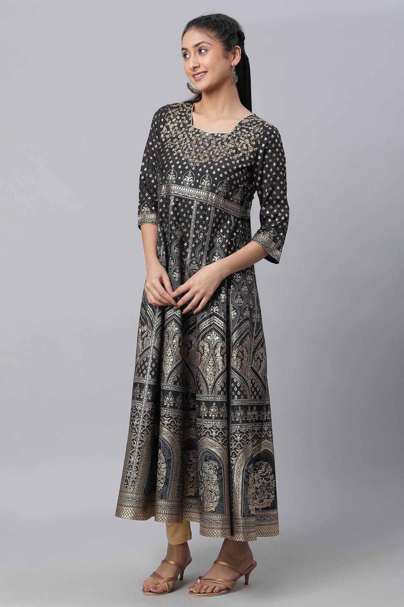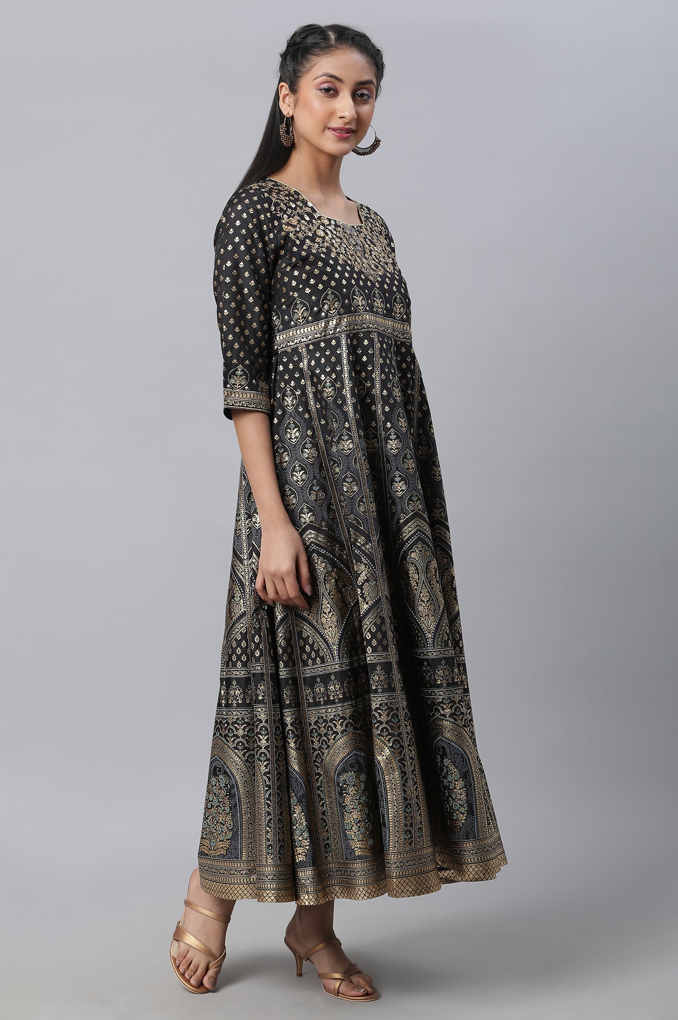 Look effortlessly stylish in this pretty dress set. This set has embellished long flared black dress which is paired with contrasting tights and festive dupatta.