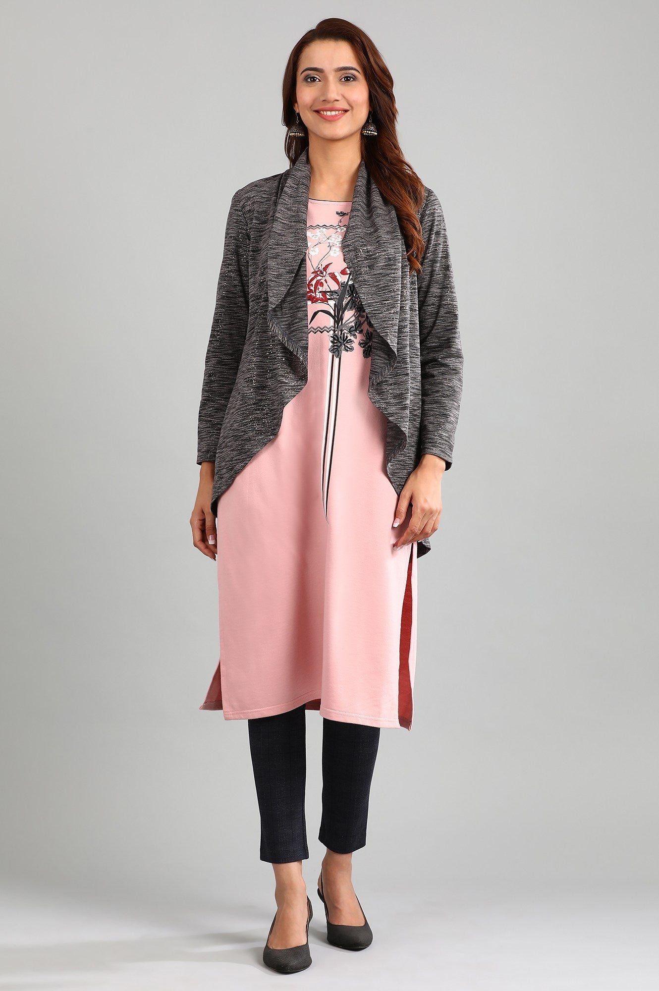 Black shawl neck yarn-dyed Gillet with asymmetrical hemline.