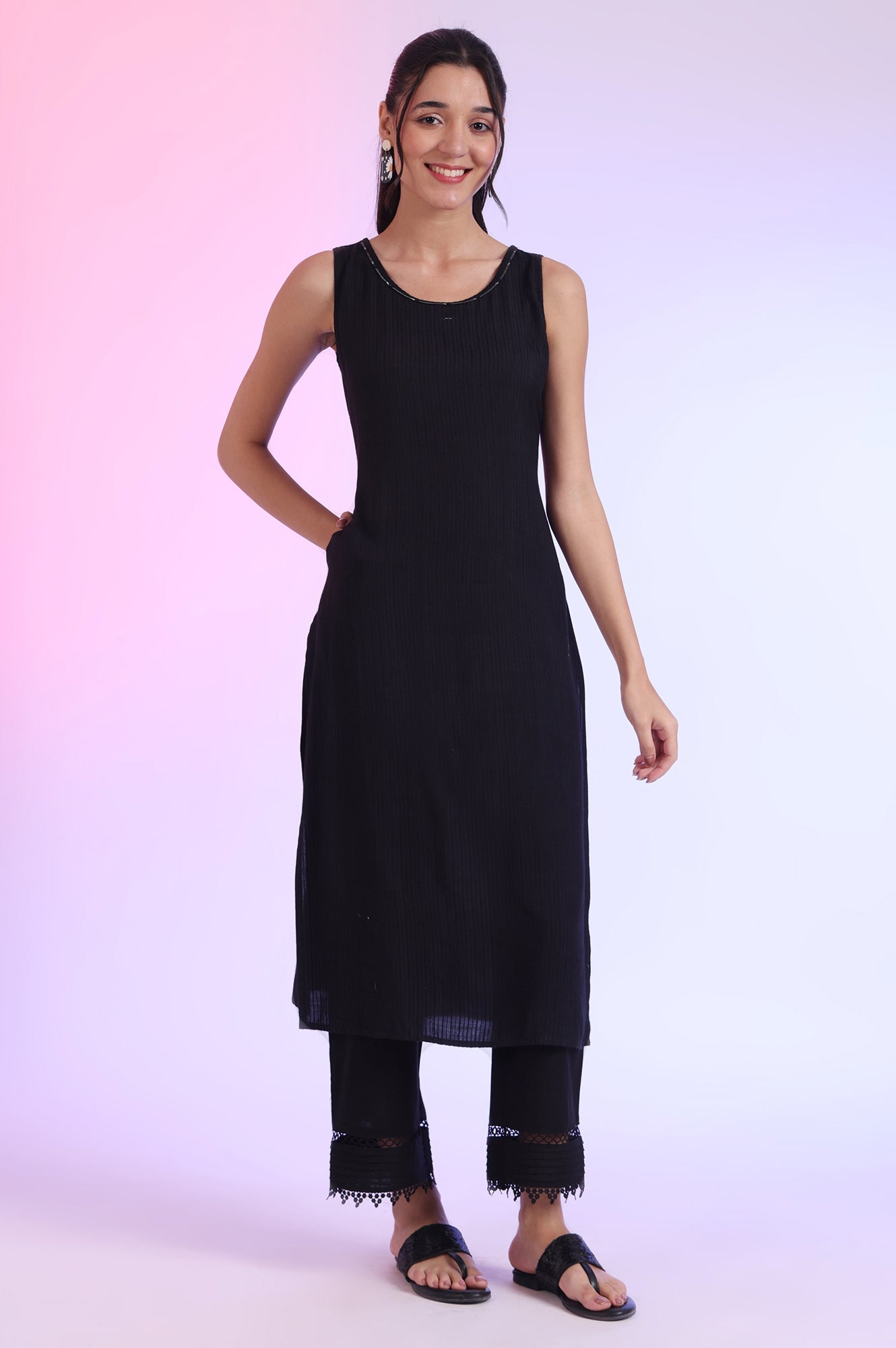 Black Solid Textured Rayon Sleeveless Straight Kurta