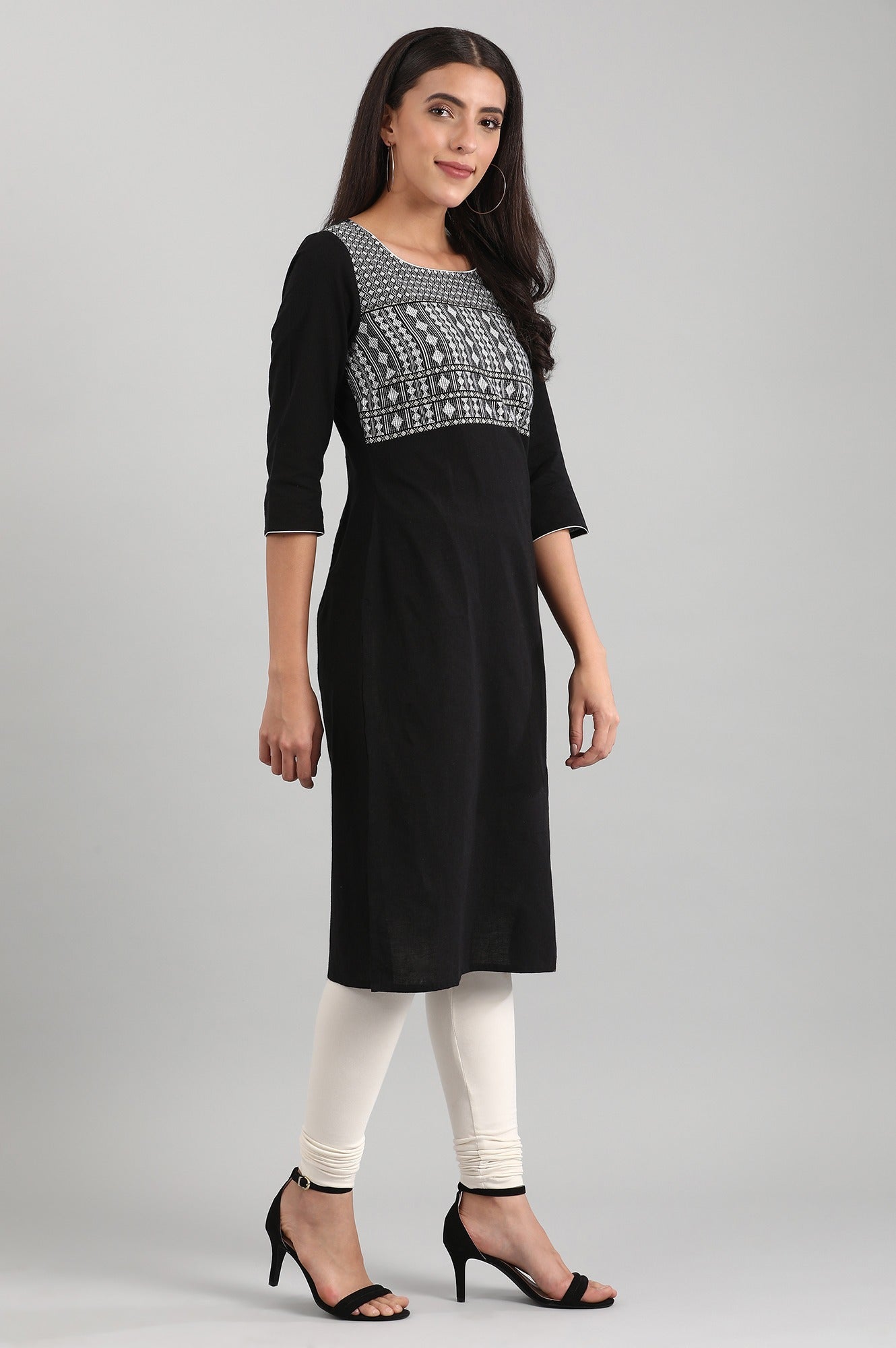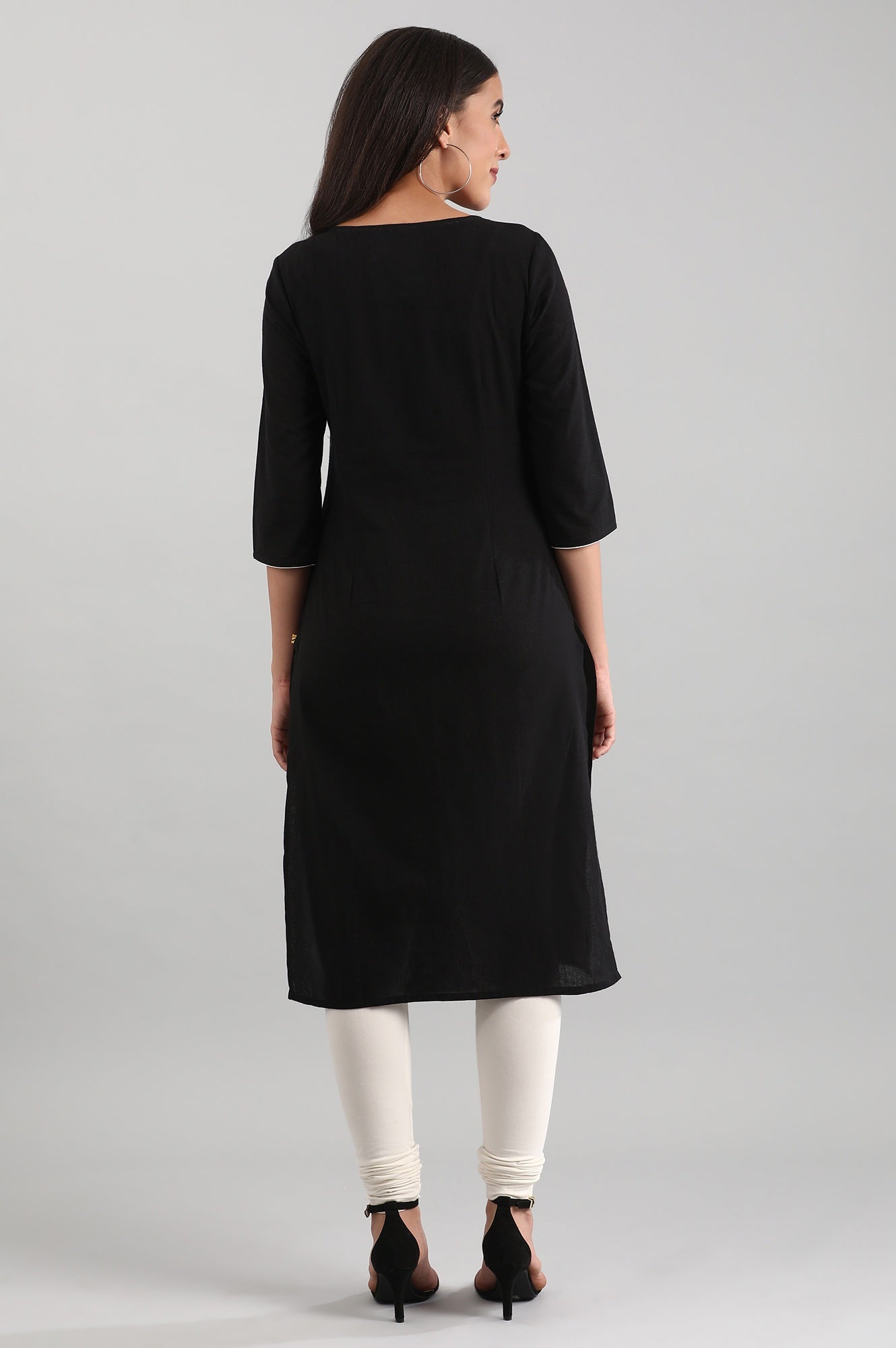 A perfect pick for your casual and workwear wardrobe. This black textured straight silhouette kurta has square neck and three-quarter sleeves.