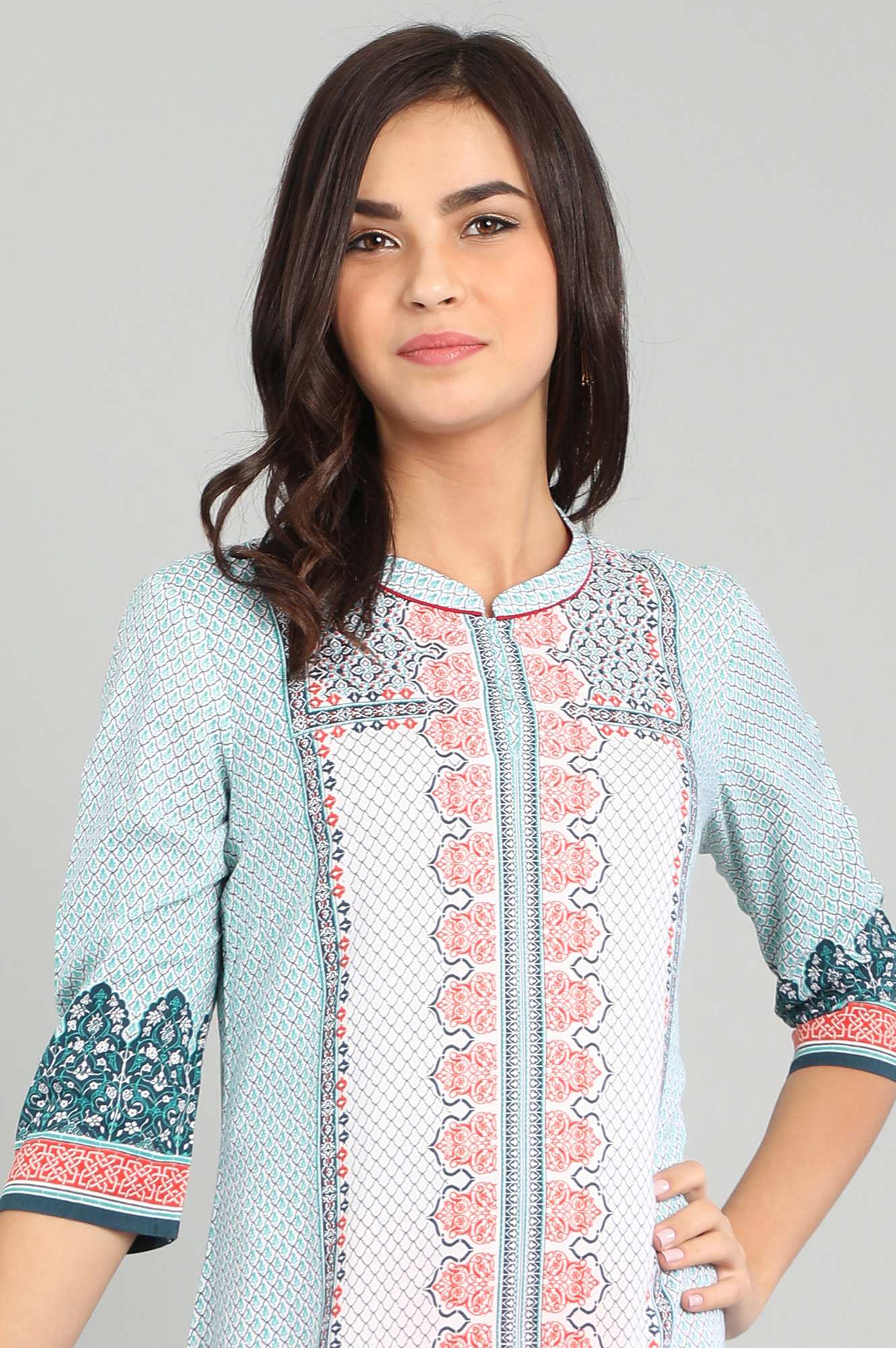 Blue band collar 3/4 sleeve kurta with printed detail and placket on the front.