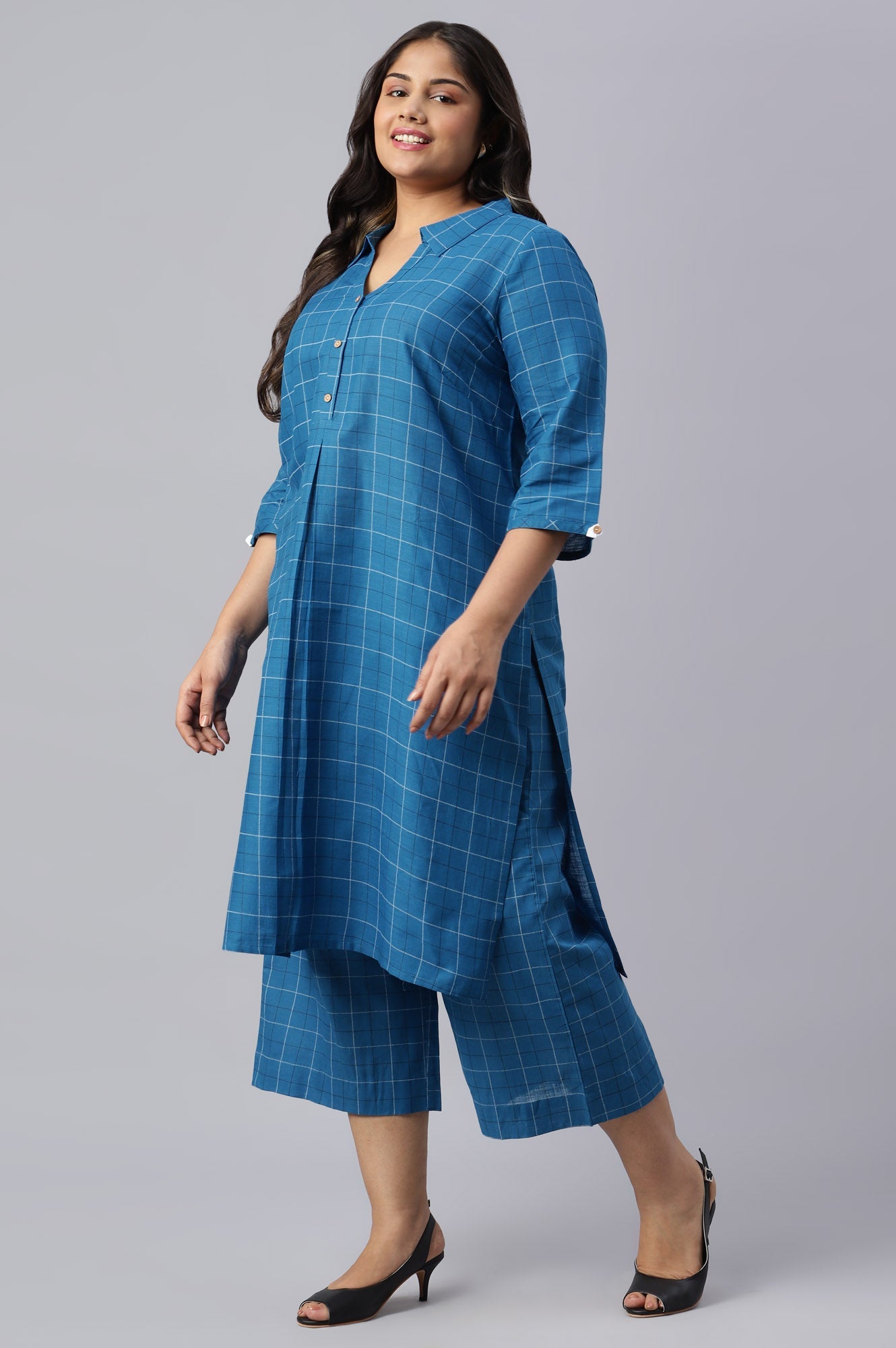 Simple and timeless, this printed blue check kurta is a wardrobe staple. It comes with a neat and crisp shirt collar, wooden buttons on the placket, an inverted box pleat at the front and a white coloured tab on the sleeves.