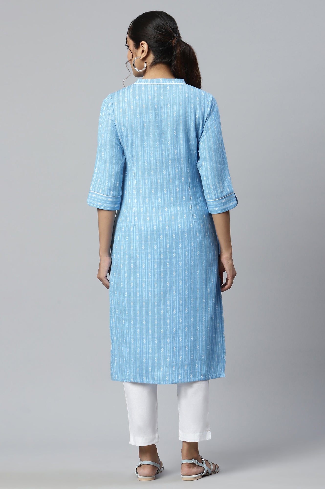 Crafted in breathable blue cotton dobby, this kurta is a winning choice for both : everyday and special occassions. It consists of an overlapped mandarin collar and a curved cuff detail on the sleeves.