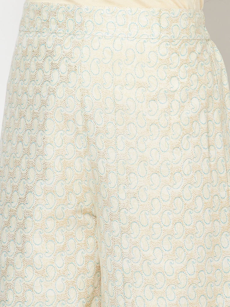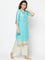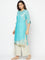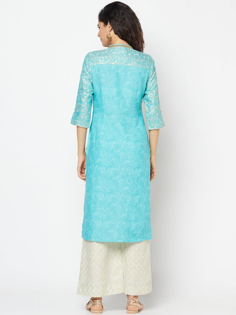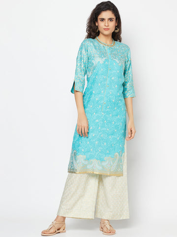 Flaunt in traditional style by wearing this ethnic set by Aurelia. The set includes blue kurta embellished with thread embroidery. It is coordinated with blue printed palazzo and dupatta.