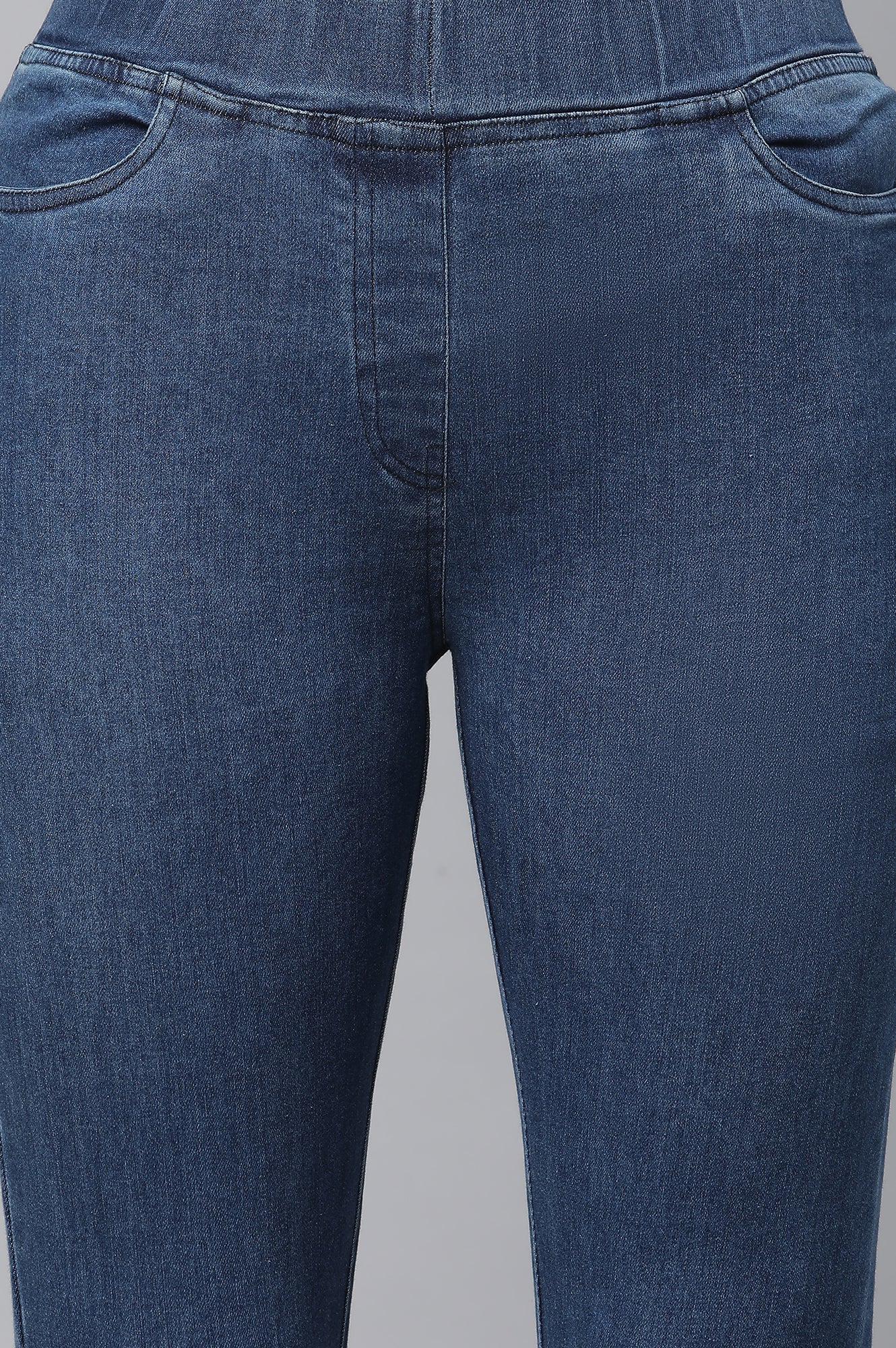 Style Your Casual Day With This Chic Aurelia Set. The Set Has Blue Jacquard kurta In Straight Silhouette And Has Round Neck. It Is Paired With Denim Jeggings.
