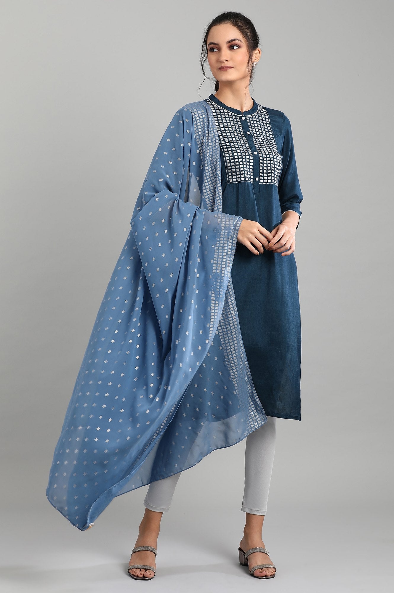 This blue mandarin neck 3/4 sleeve kurta has button placket on the front, printed detail and side slits.