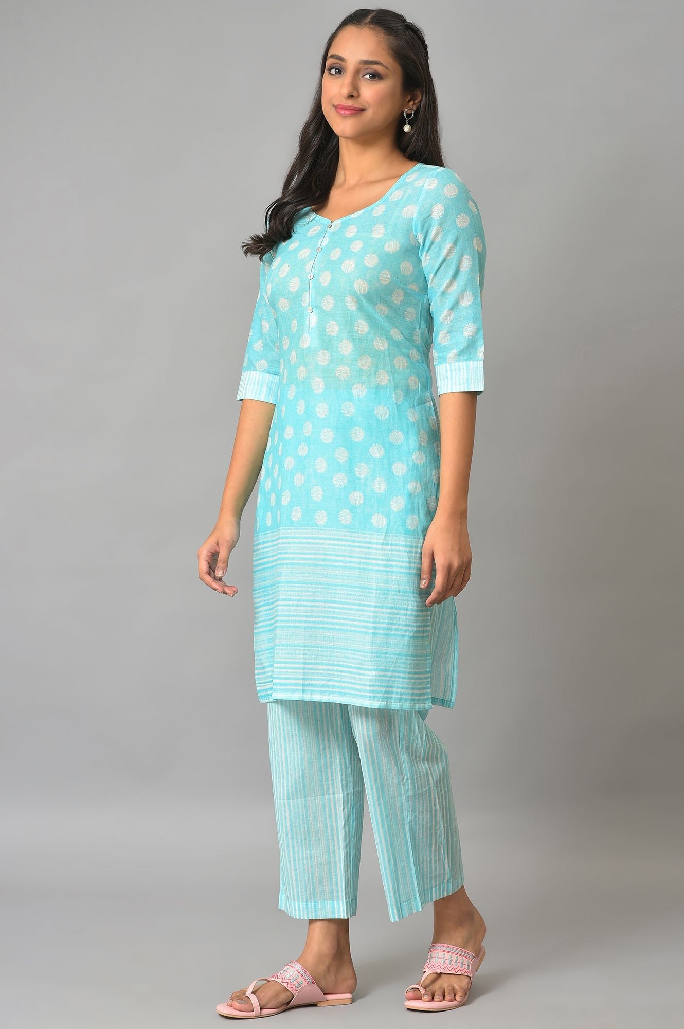 Blue Polka Dots Printed Cotton kurta With Narrow Palaza