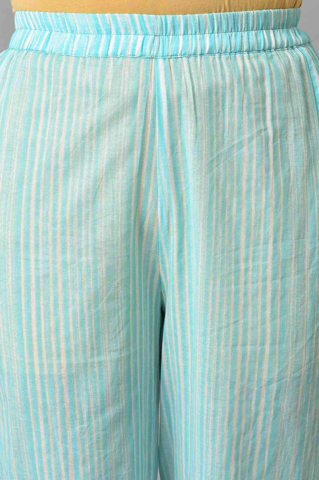 This Exquisitely Designed Two Piece Cotton kurta Set Is An Absolute Must-Have This Season. This Modern Print kurta Is Crafted In Premium Cotton Fabric And Features A V Neckline With Piping Insert And Button Details. It Is Coordinated With Yarn-Dyed Tonal Stripe Printed Narrow Palazzo.