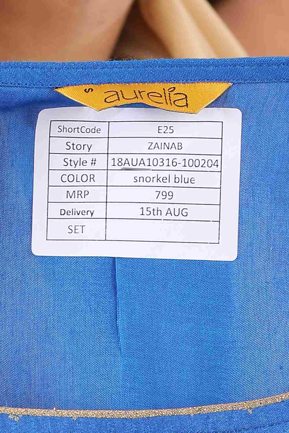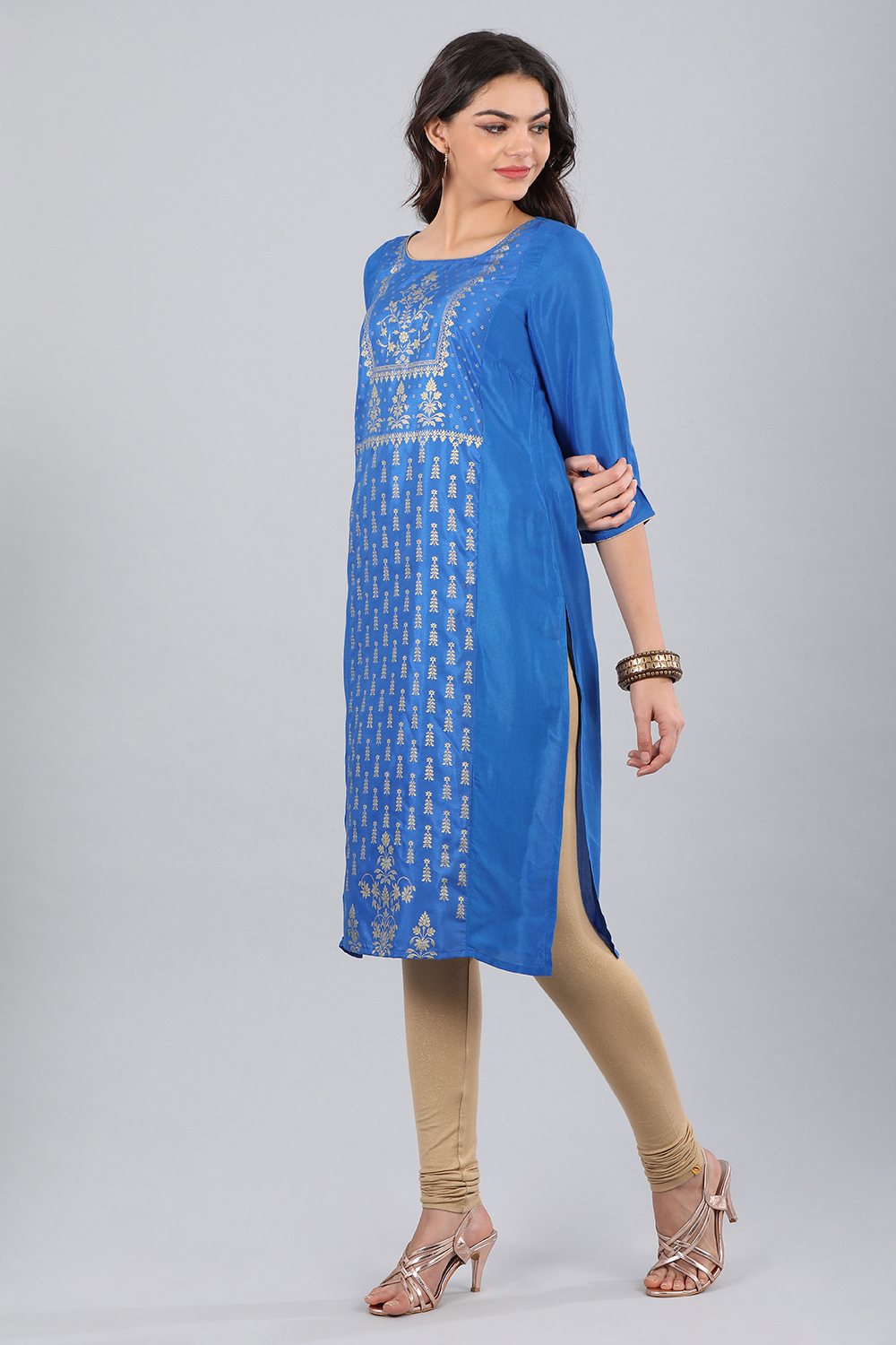 Blue round neck 3/4 sleeve kurta with printed detail.