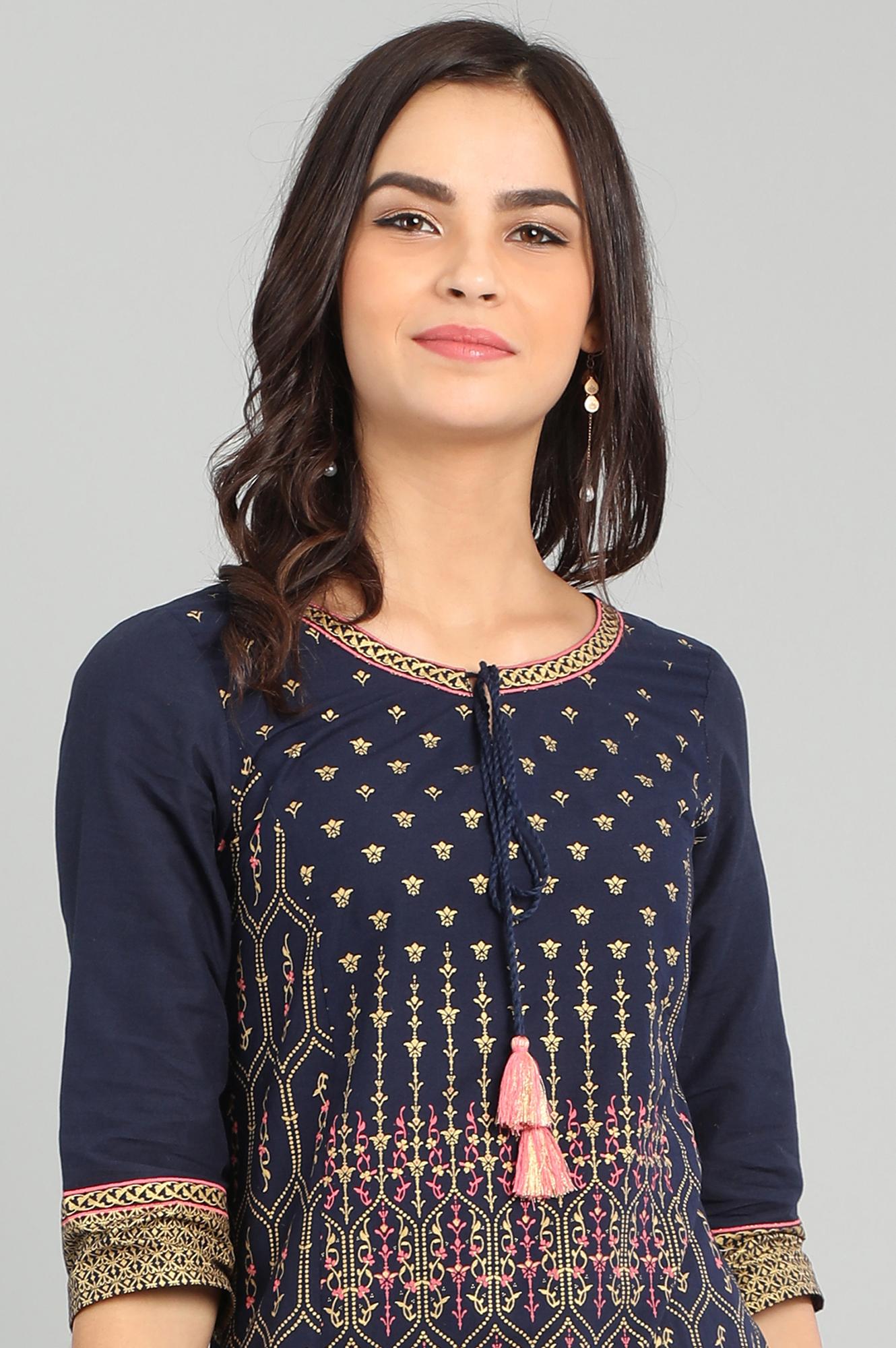 Grey round neck 3/4 sleeve kurta with printed detail and dori.