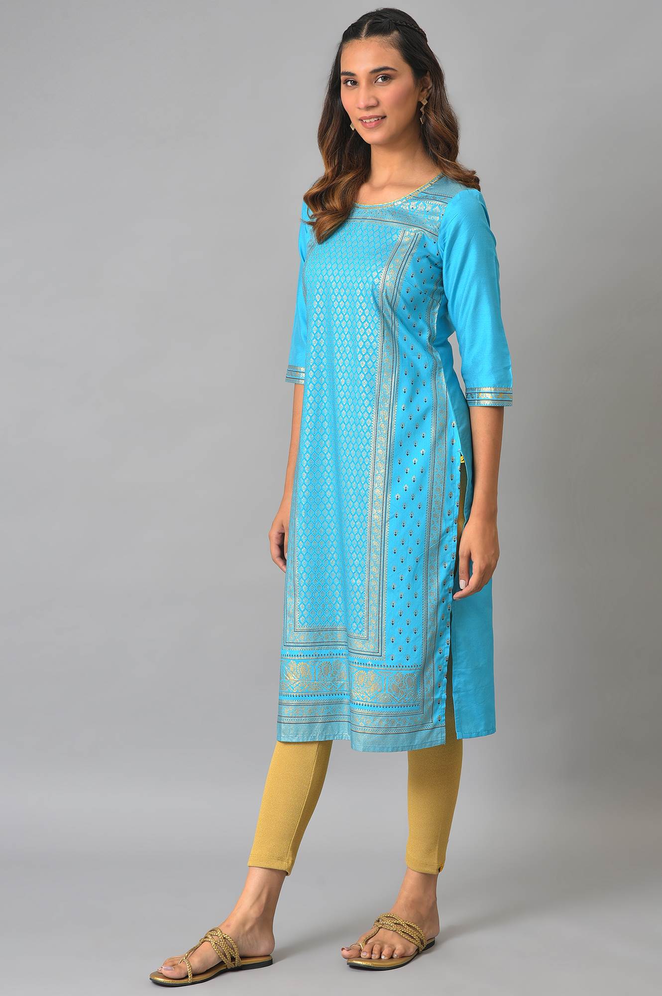 This Festive Season Revamp Your Wardrobe With This Aurelia'S Must-Have Kurta. Blue Foil Printed Kurta Having Sequin Work On Neck. It Features Round Neck And Three-Qaurter Sleeves.