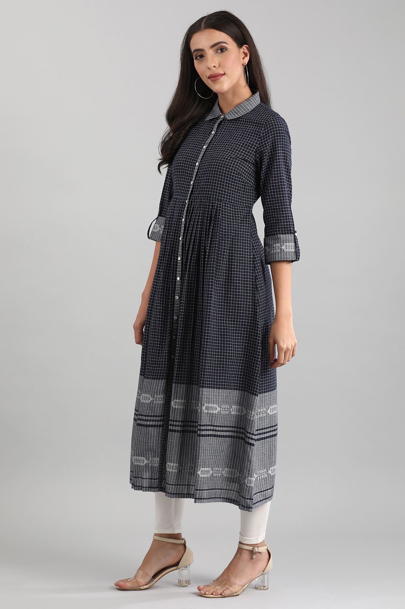 Blue shirt collar A-line kurta with gathers, placket detail and checkered pattern. This is exclusively from Disha's must-have closet.