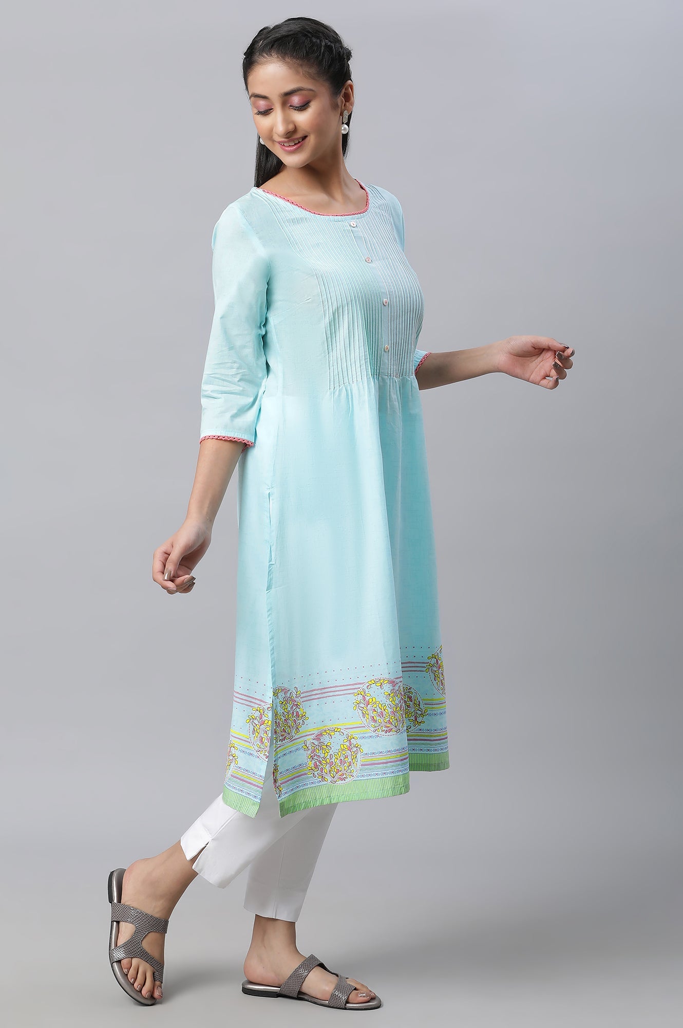 Style your casual day look with this chic light blue straight kurta. The kurta has print on hemline and pleats on yoke.