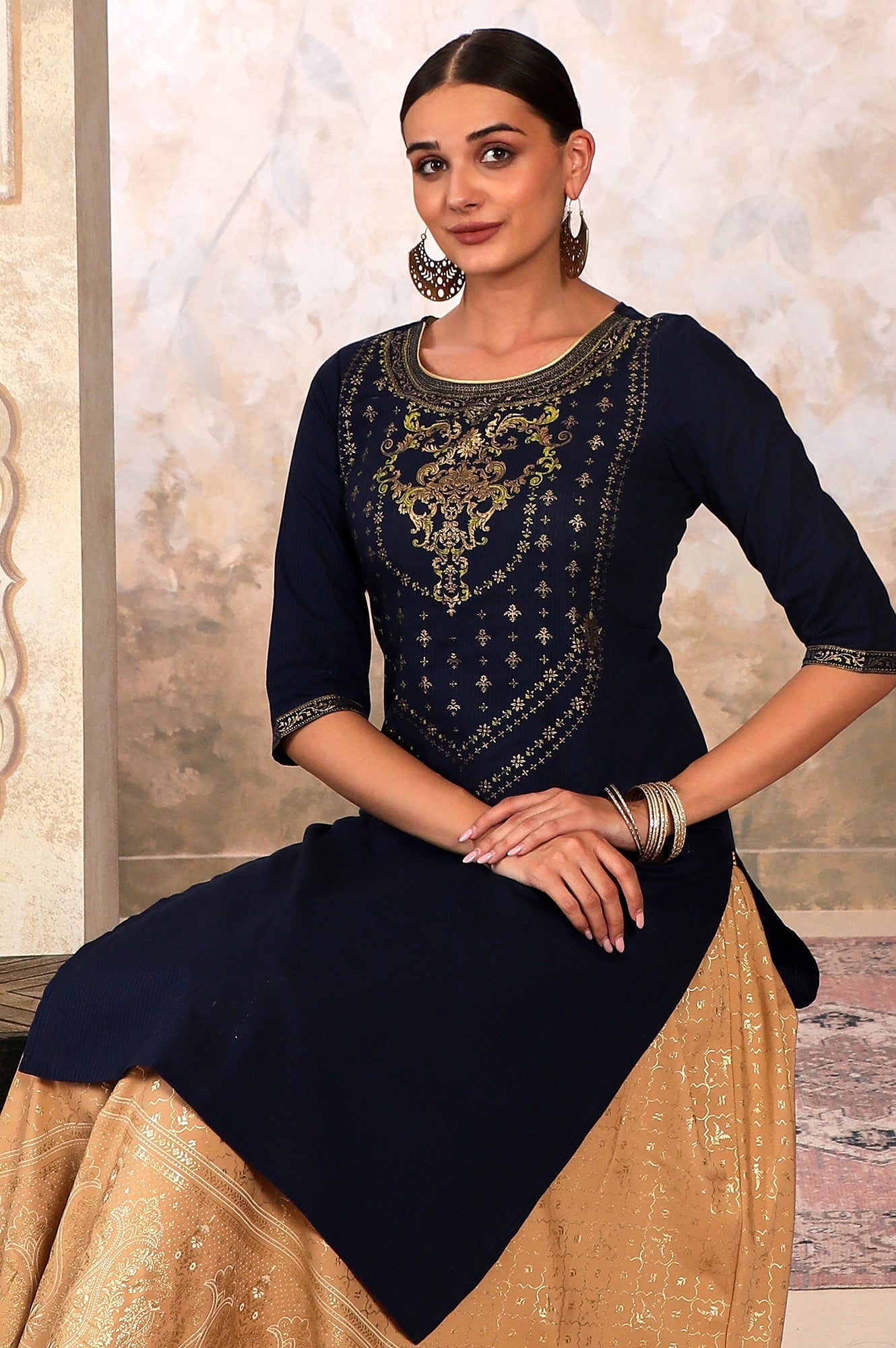 Exclusive festive colour for your special occasion. This heavy gold printed yoke kurta with similar printed patch border on sleeve opening is a must-have for this festive season. It comes in round neckline and straight silhouette.
