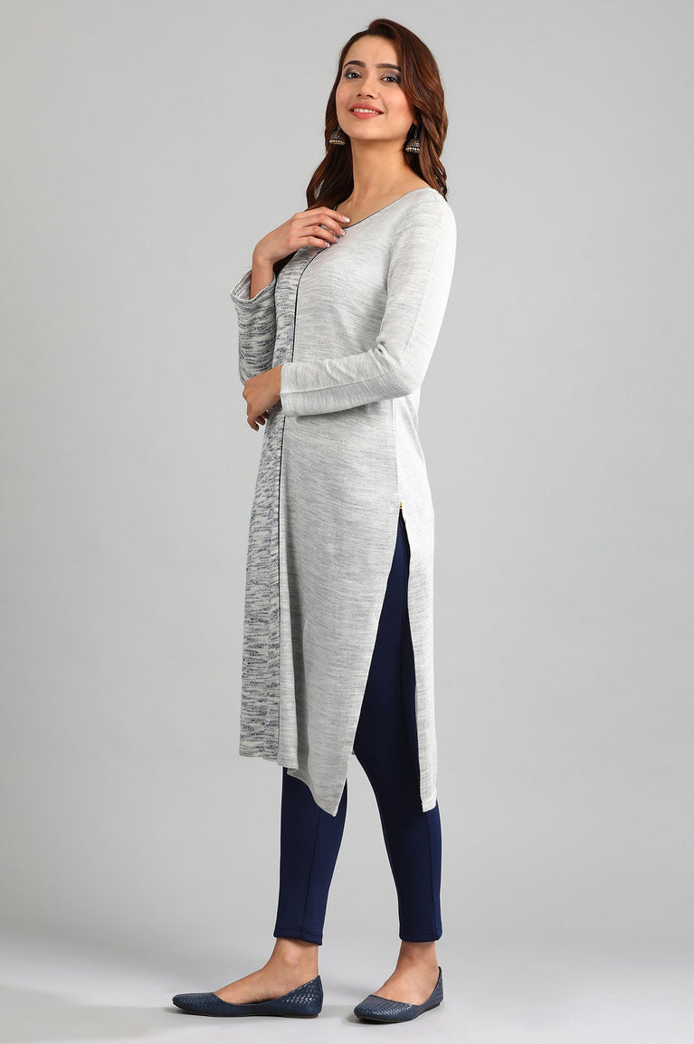 Grey round neck 3/4 sleeve kurta with printed detail and dori.