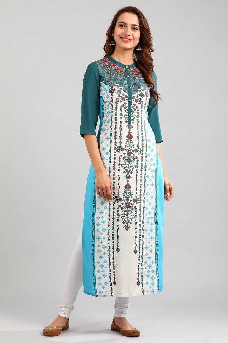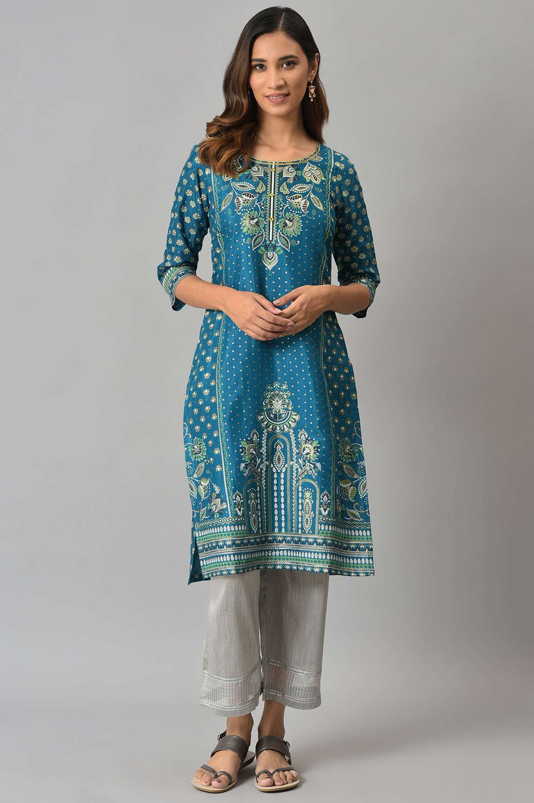 A perfect pick for your casual and workwear wardrobe. This blue straight silhouette printed kurta has round neck and three-quarter sleeves.