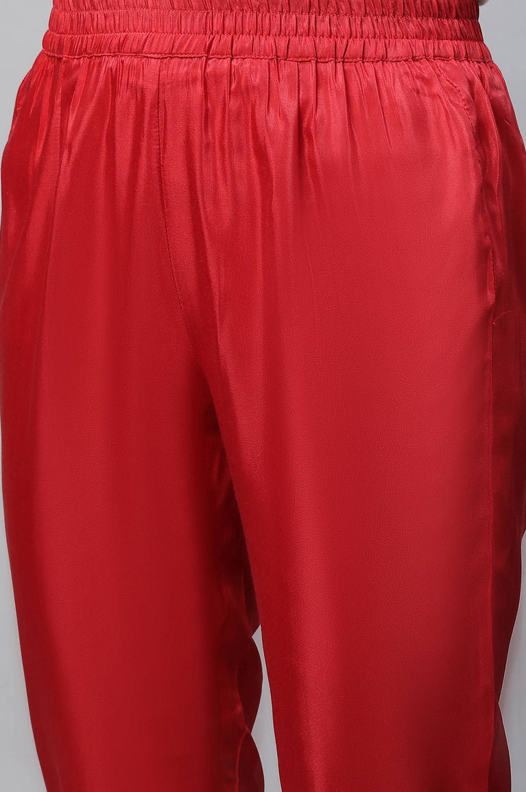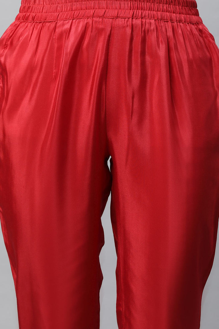 Flaunt Your Stylish Look In This Chic Aurelia Set. The Set Includes Blue Floral Printed kurta In Cuff Sleeves. It Is Paired With Red Trousers And Printed Dupatta.