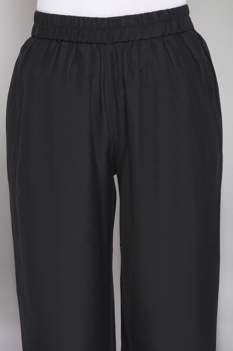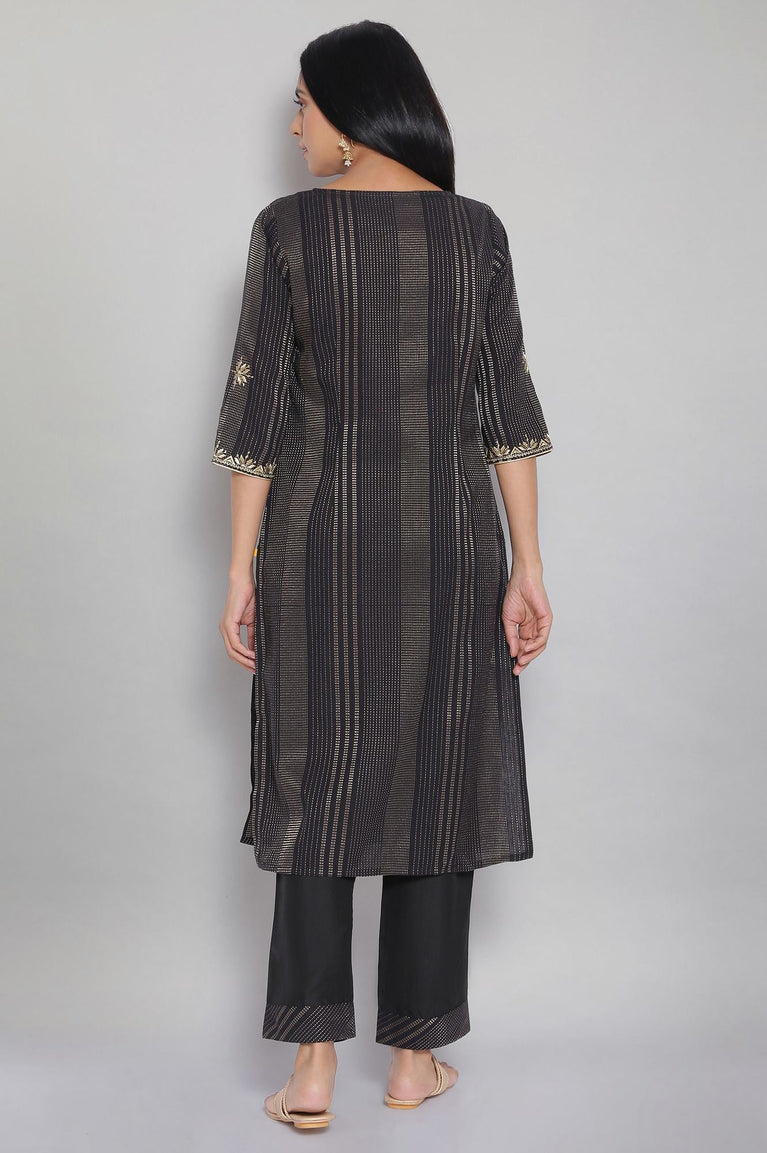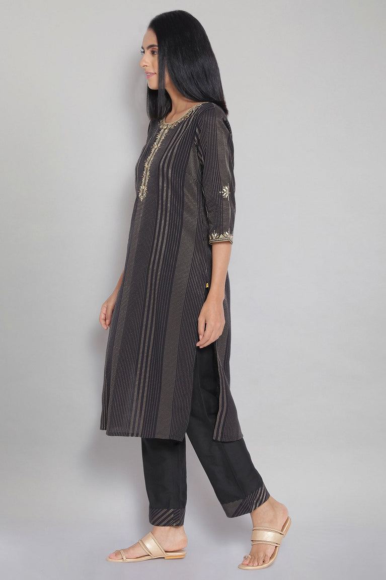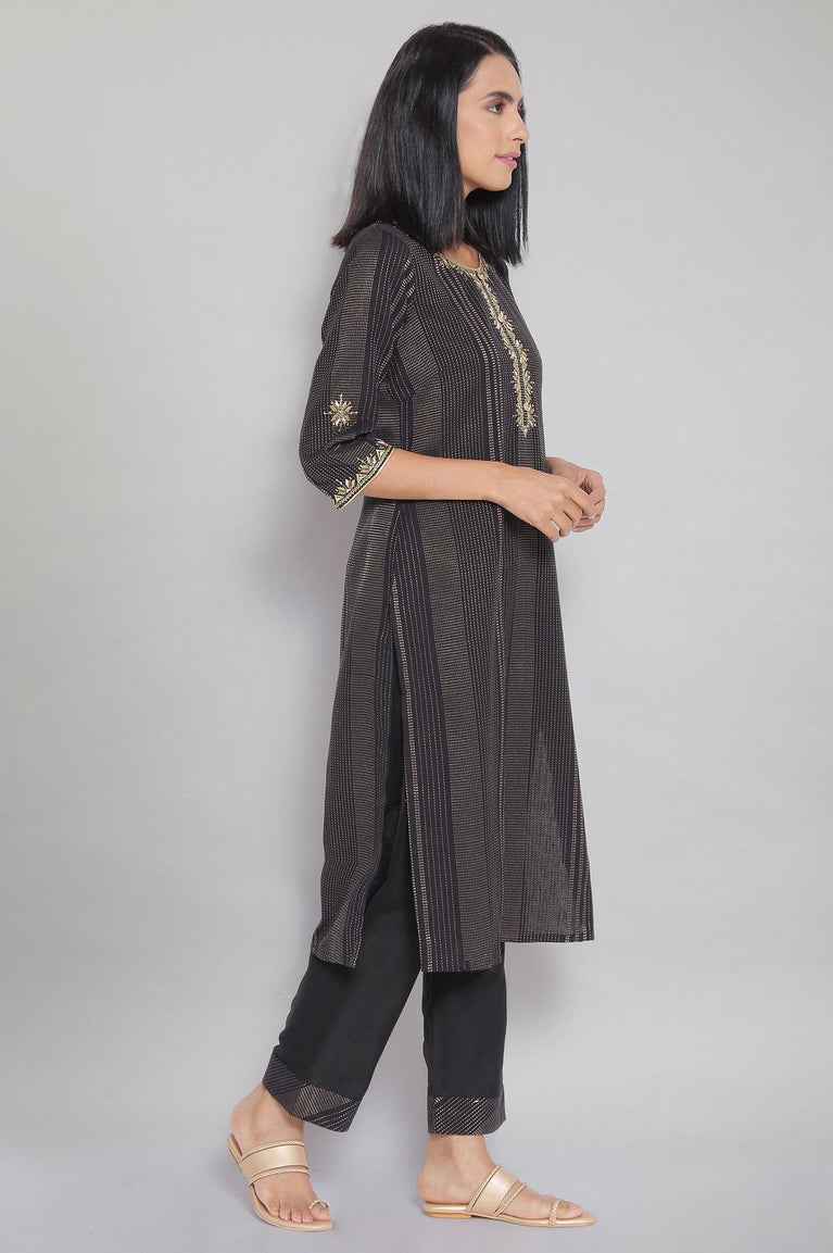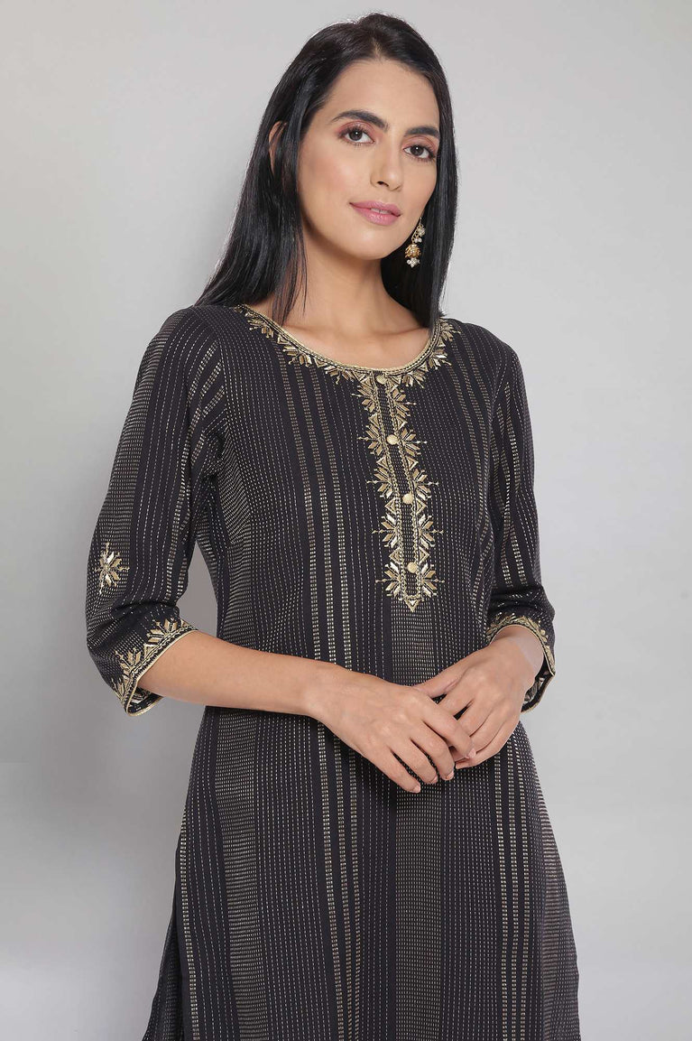 Ethnic kurta And Palazzo Set In Yarn-Dyed Fabric That Gives You Classy Look. The kurta Has Round Neckline With Zari Embroidery And Coordinated With Matching Solid Palazzo Pants In Ankle Length And High Rise.