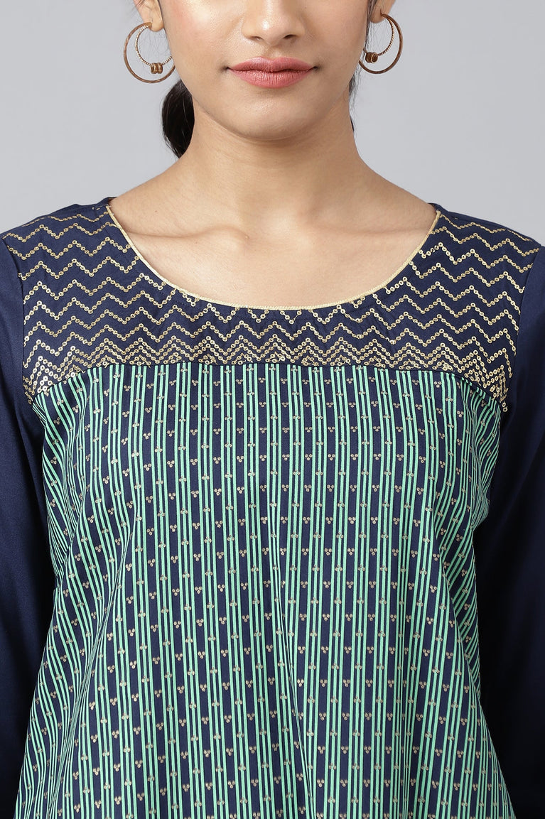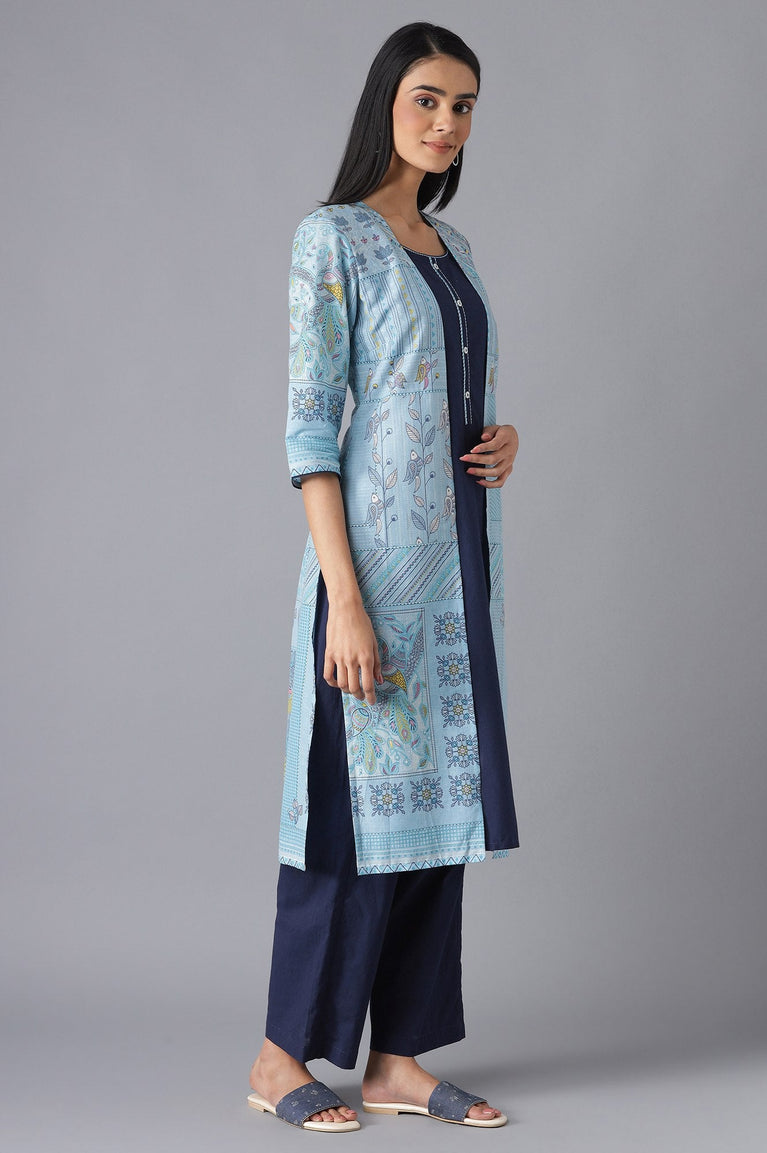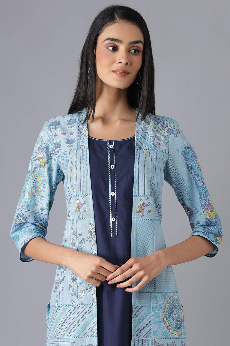 Give winter chills a warm welcome with this Ink blue winter ethnic winter kurta. This straight silhouette kurta features round neck and geometric print with border at hem.