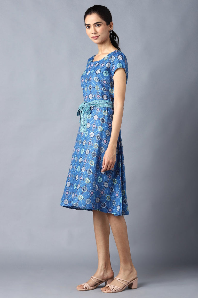Sprinkle Your Magic All Round With This Blue Indigo Flared Dress. Crafted In Premium Fabric, The Dress Features Circular Hemline And Has Round Neck. It Comes With A Fabric Belt That Defines Your Waist Perfectly.