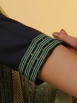 This is a color blocked kurta that features coloured stripes and golden foil printed polka dot pattern. The yoke has been highlighted with glitter sequin embroidery that follows a zig-zag fashion.