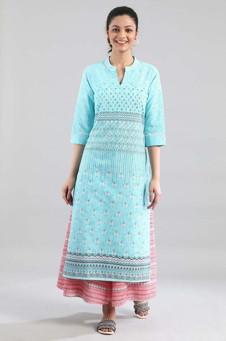 Elegant yet stylish, this light festive kurta set is a must-have for summer wardrobe. Get the chic look in this ethnic set by Aurelia. The set includes blue printed kurta in straight silhouette and it is paired with white flared palazzo. The set also comes with a white dupatta.