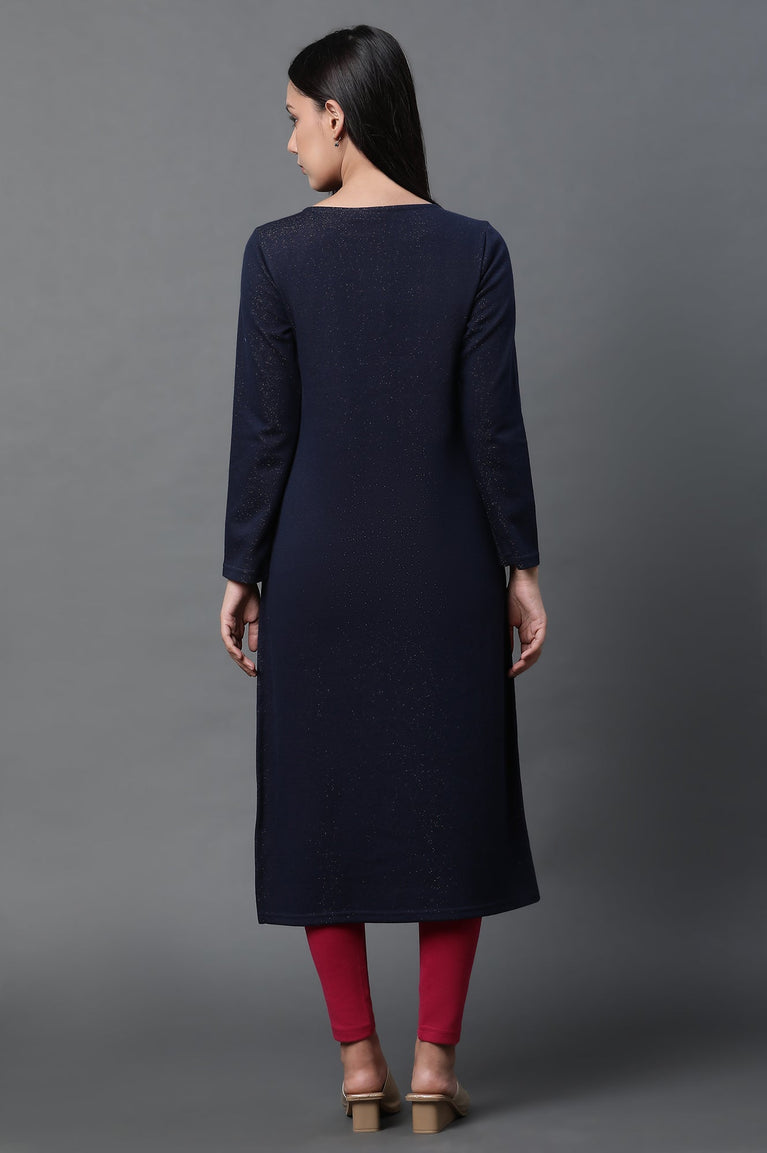 A perfect pick for your casual and workwear wardrobe. This black textured straight silhouette kurta has square neck and three-quarter sleeves.