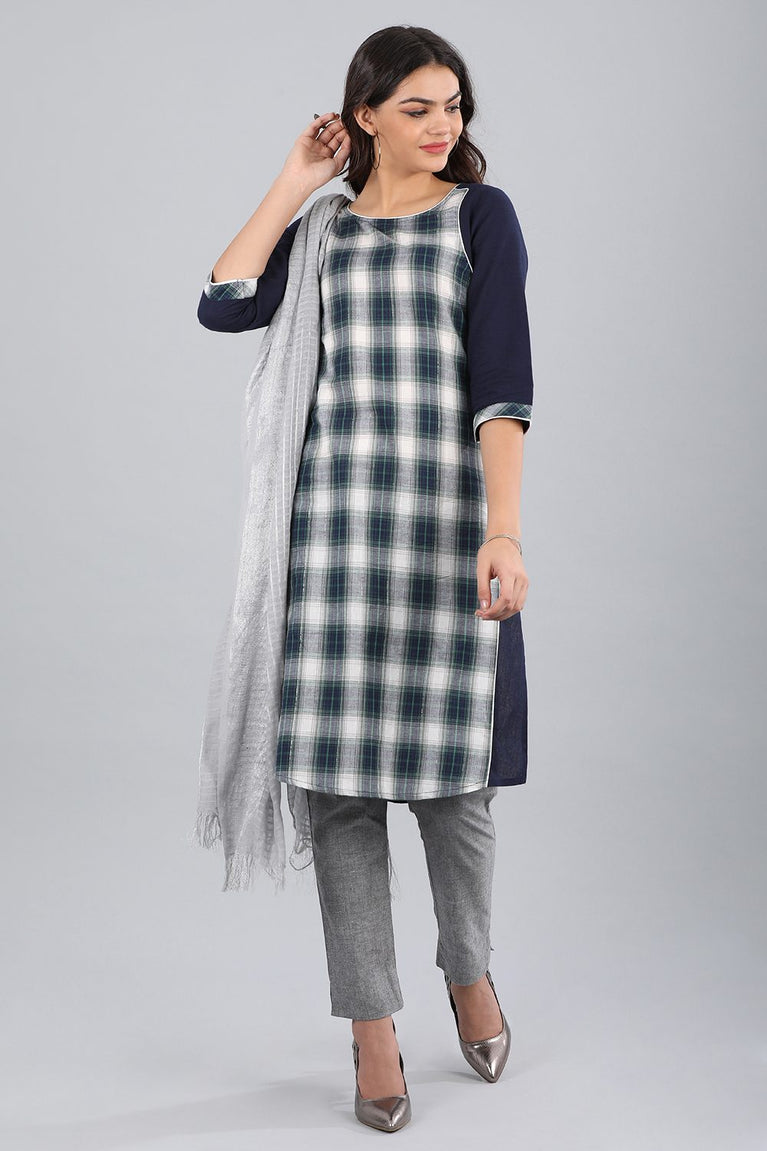 Blue shirt collar A-line kurta with gathers, placket detail and checkered pattern. This is exclusively from Disha's must-have closet.