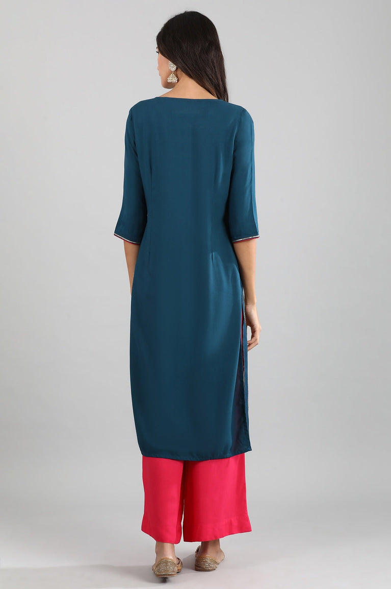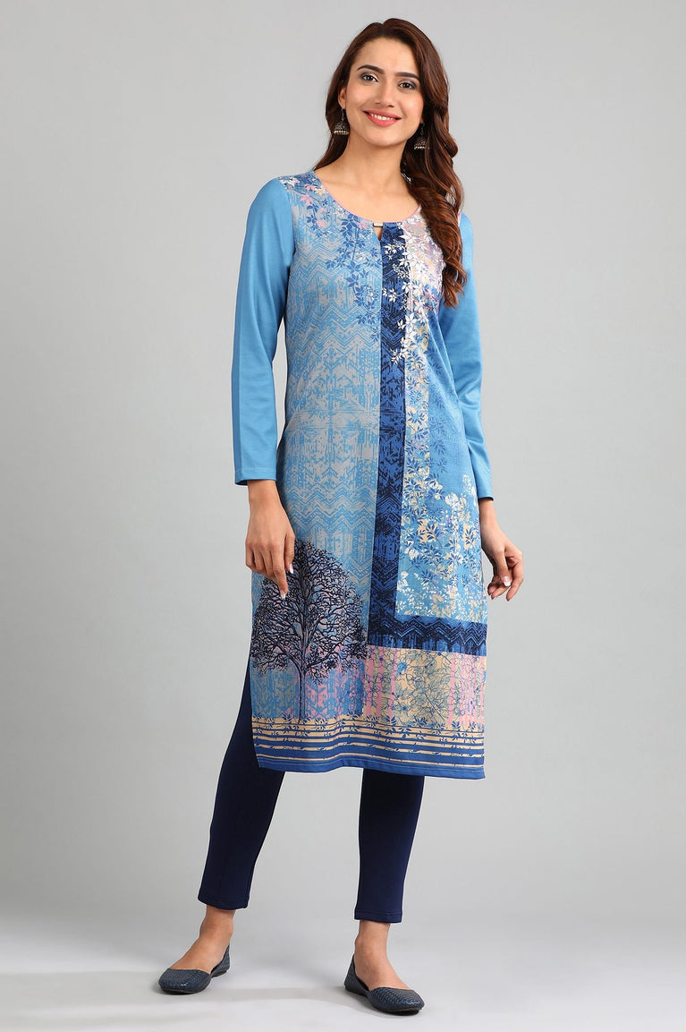 This blue round neck 3/4 sleeve kurta has printed detail and side slits.
