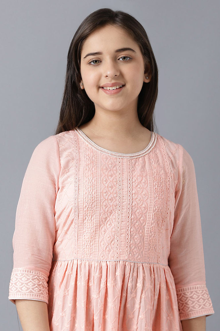 Girls Peach Sequinned Flared Schiffli Dress