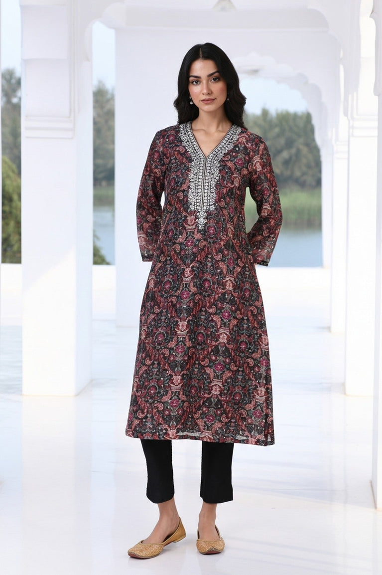 Timeless elegance meets modern craftsmanship in this black embroidered kurta set for women. The straight silhouette kurta features intricate embroidery on the neckline, hemline, and three-quarter sleeves, creating a refined ethnic look. Paired with relaxed-fit pants adorned with matching embroidery, this set is perfect for festive gatherings or traditional celebrations. The breathable fabric ensures comfort, while the embroidered accents add a touch of sophistication. Complete with side slits for ease of movement, this kurta set is a versatile addition to your wardrobe. Elevate your style effortlessly with this curated ensemble.